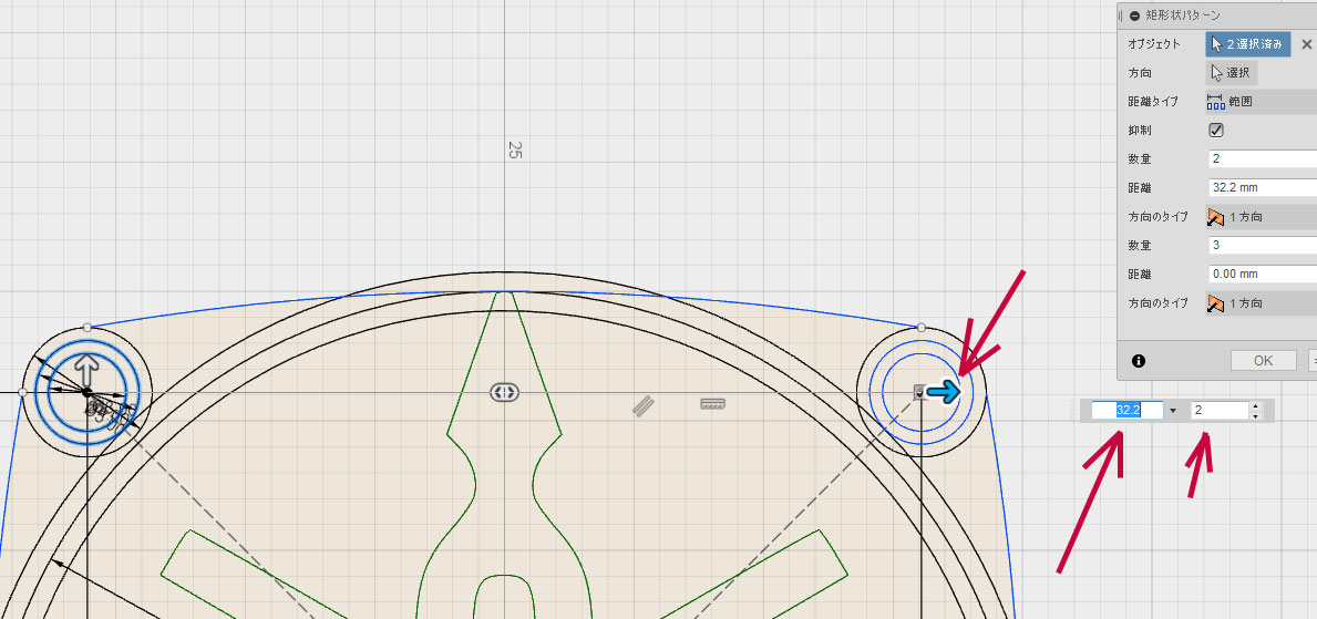 2つの円を右方向に32.2mm間隔で2個設定にすれば、右側に一つコピーが出来上がる。 ちなみに、それぞれ個別に作らず、コピー作成方式としておくことで、親側の設定を変更すると、コピー側も自動反映となる。 独立しているオブジェクトは、コピーしない方が良いが、今回のように同じように作成する部分はコピー作成しておいたほうが、 後々の設計変更時に楽になる(はず)。