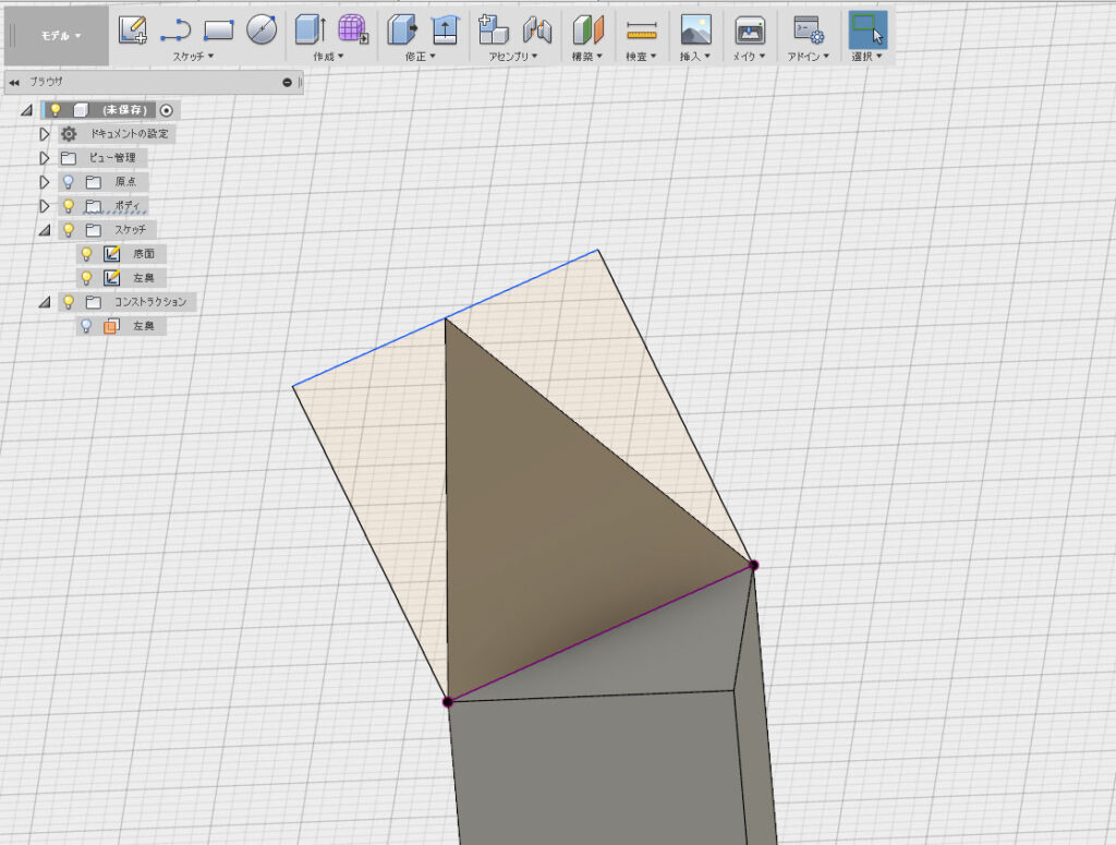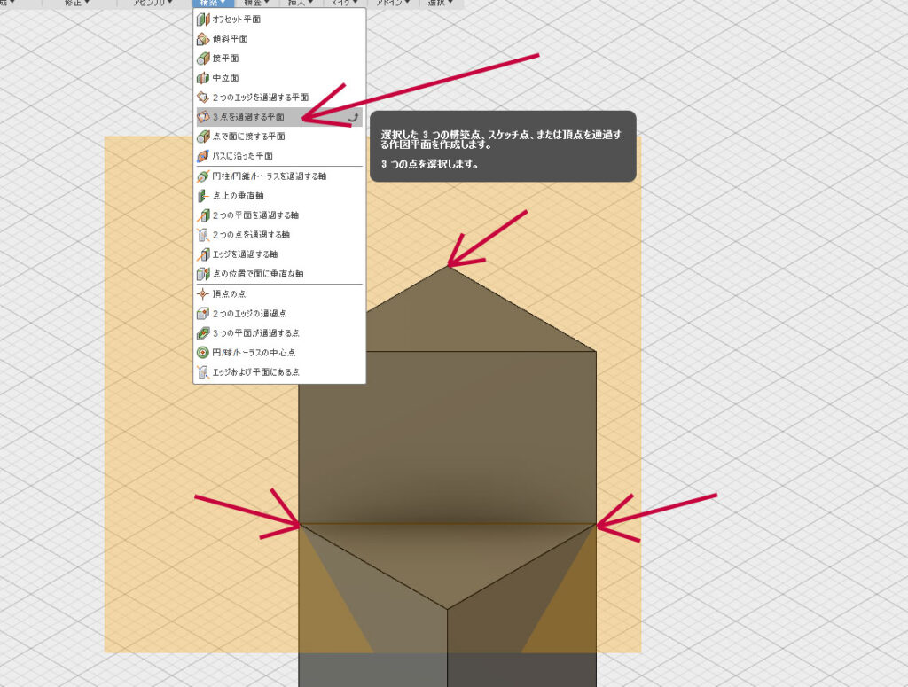 次に、構築メニューから「3点を通過する平面」を選択し、三角柱の直角部分の頂点と、三角柱の根本の鋭角の頂点の3点を選択して、 三角柱を斜めに通過するような平面を構築する。
