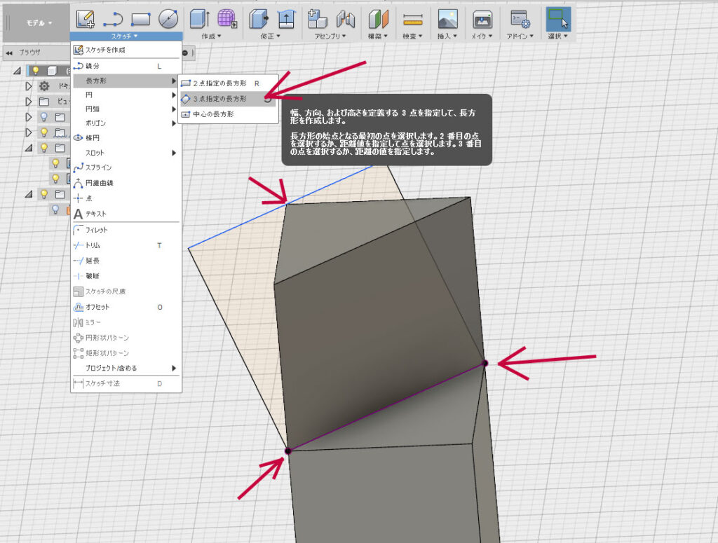 そして、その平面でスケッチを作成。四角形の3点指定を選んだら、先程と同様に三角柱の直角部分の頂点と、 三角柱の根本の鋭角の頂点の3点を選択して、四角形のスケッチを作成する。