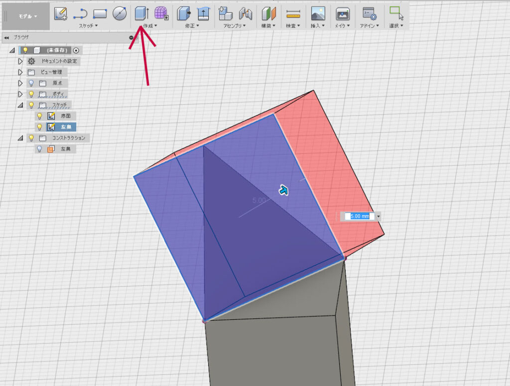 スケッチを終了して、押し出しで先ほど作成した四角形を使って「切り取り」操作の押し出しを行う。 5mmくらいにすると三角柱の半分上面が全部削除できるので、除去する。