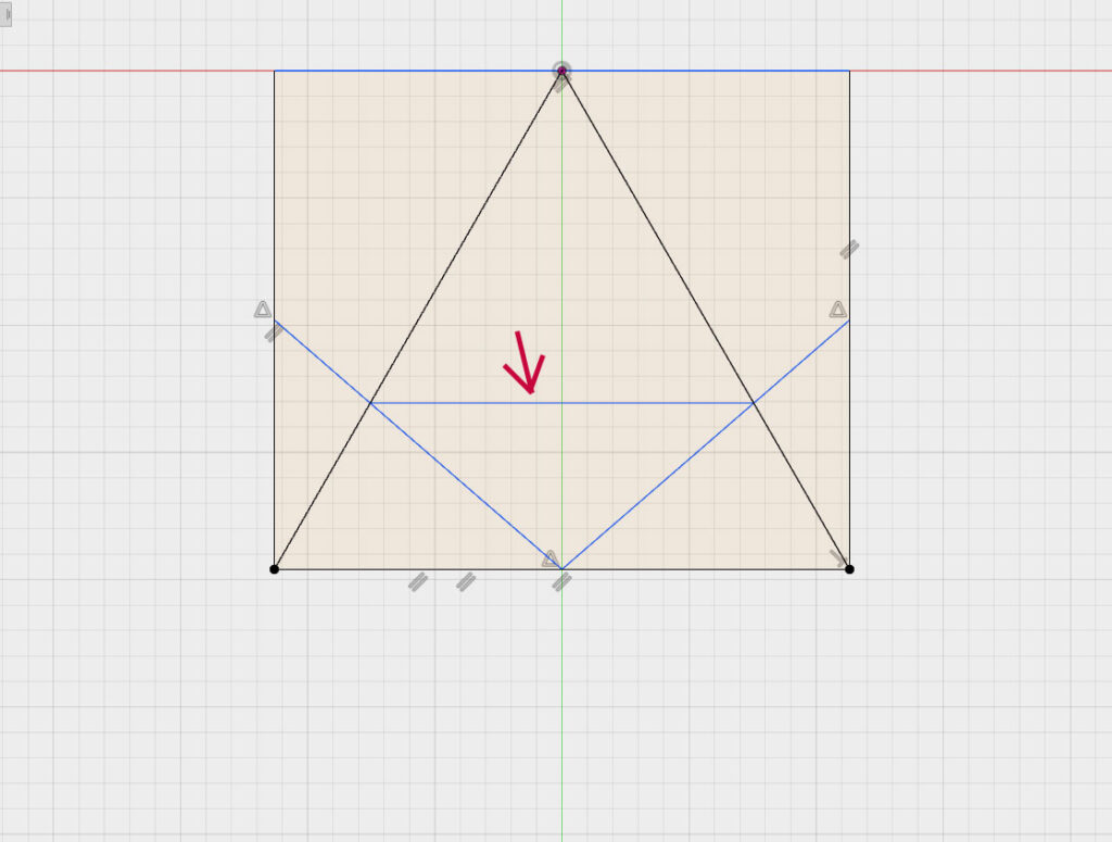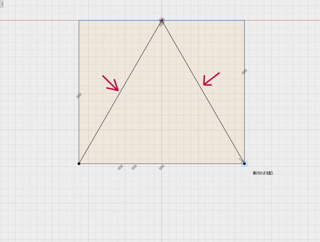 まずは、上辺の真ん中から左右の角に線を引く。スケッチの「線分」で実行。