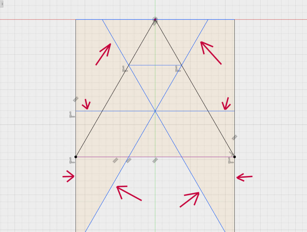 さっきと同じく左右の斜め線の交差箇所同士を水平に繋ぐ線を引き、またその両端から下の先の中心部分に向けて線を引く。 真ん中に下向きの正三角形ができれば良い。