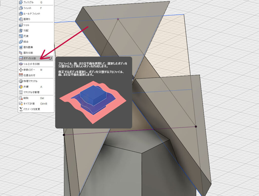 対象ボディは当然このボディを選び、分割ツールとして、柱の側面を選択する。すると、柱の側面位置を基準に、 はみ出ている部分がボディと切り離されて、別のボディが出来上がる。