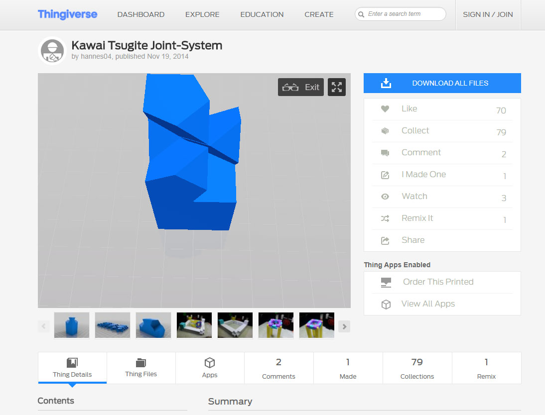 いろんなものが存在しているが、気になった継手としては「河合継手」。 これを試してみたい。しかし調べてみると気になる人は多いようで、Thingiverseにもデータはあった。