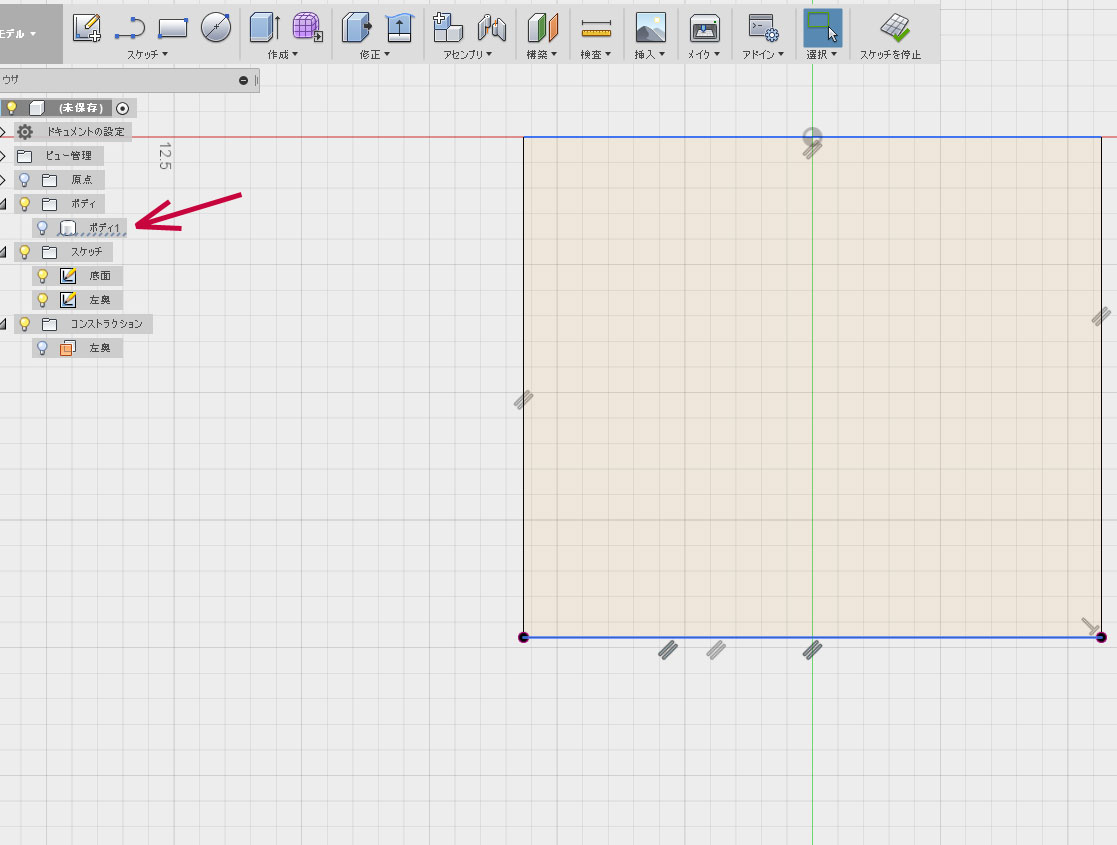 では、先程の平面につくったスケッチをもう一度編集状態とする。 編集状態にすると、三角柱の斜めカット前に戻るために、ボディがちょっと邪魔。ボディは一旦「非表示」にしておこう。