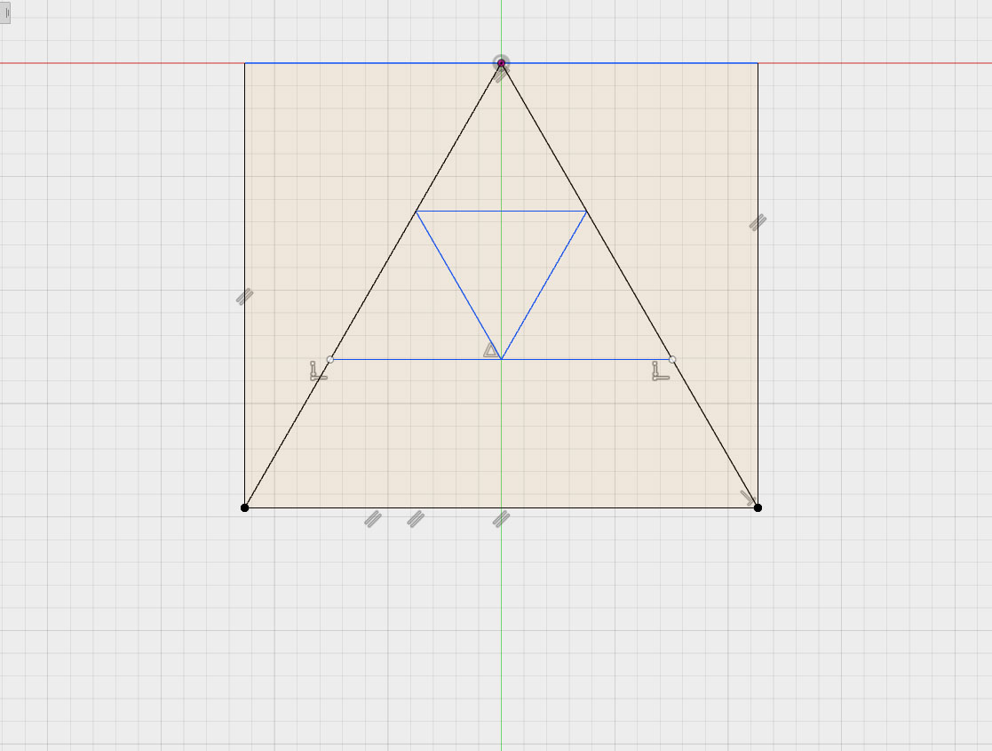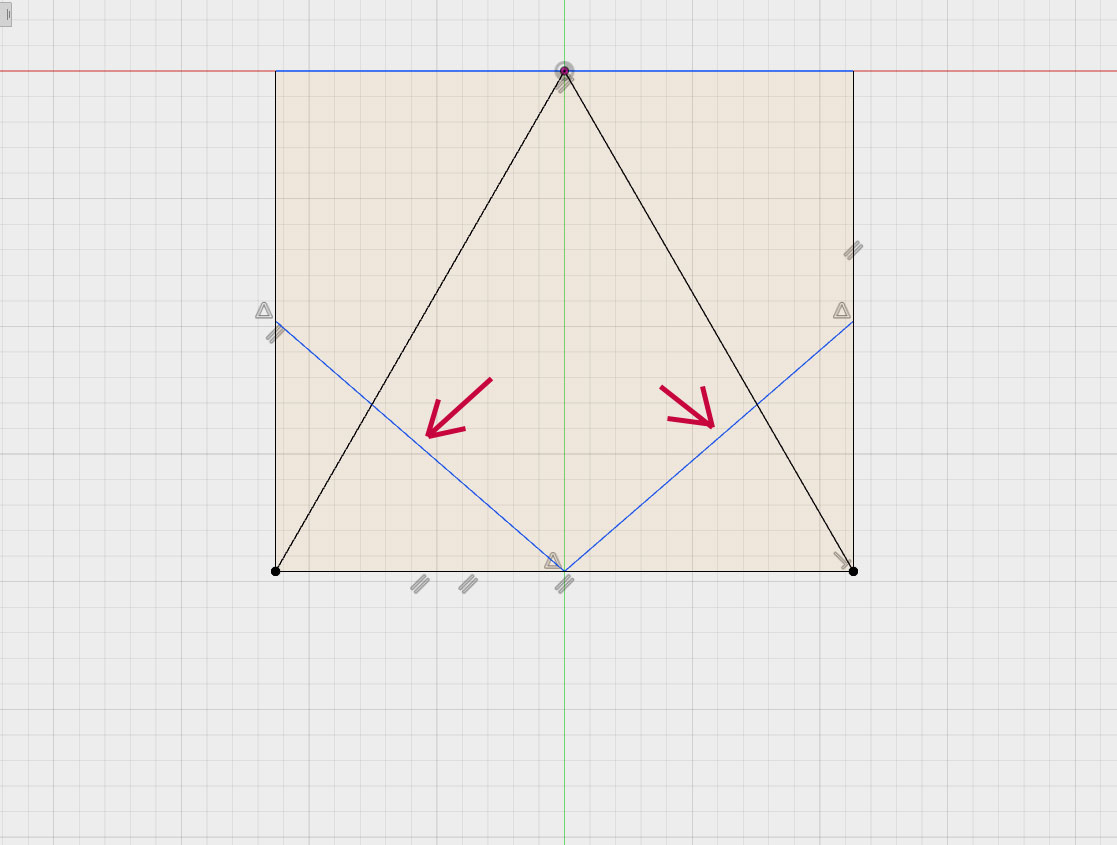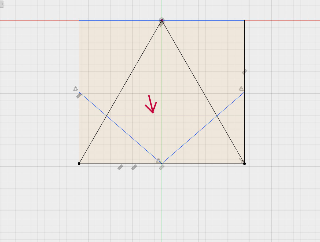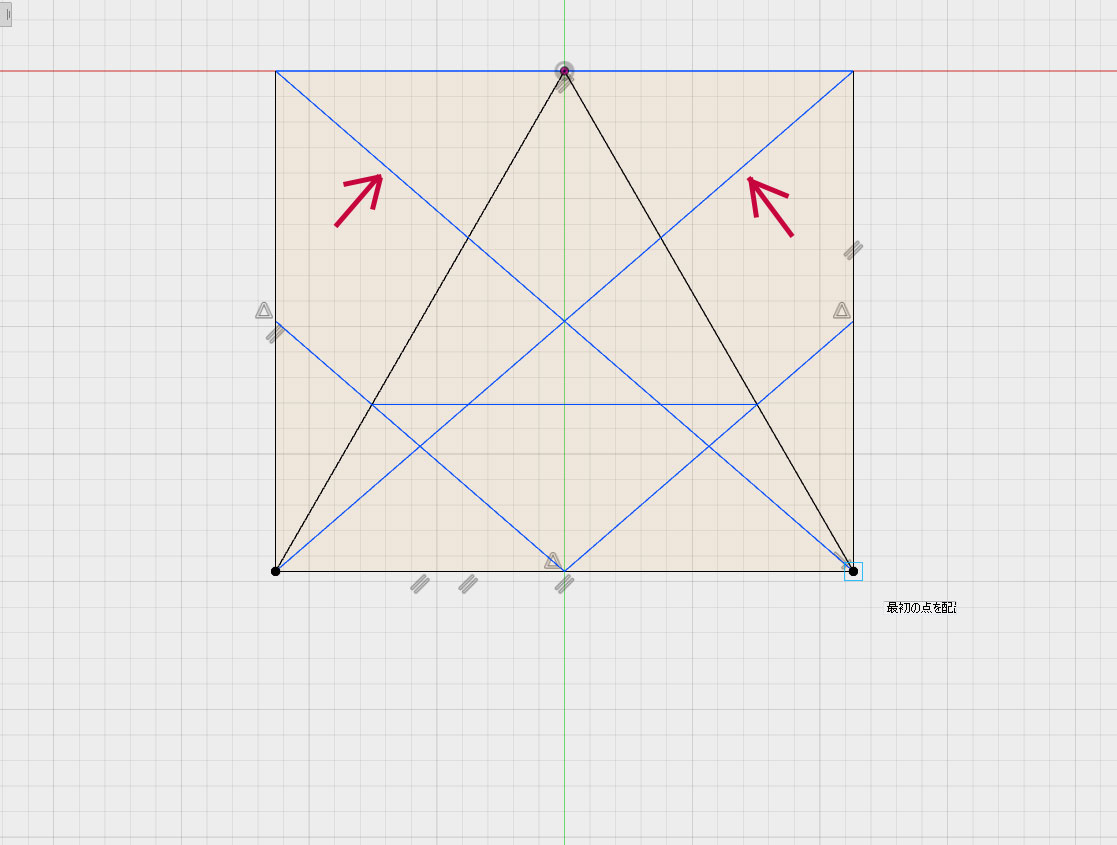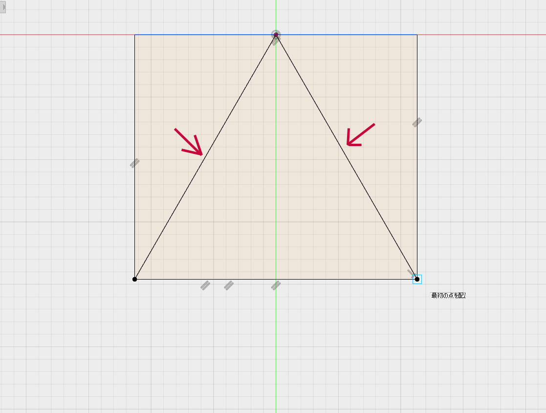 まずは、上辺の真ん中から左右の角に線を引く。スケッチの「線分」で実行。