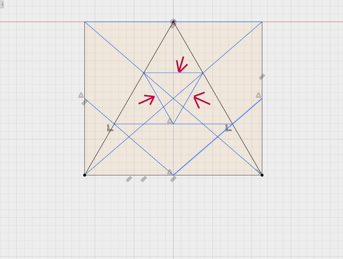 さっきと同じく左右の斜め線の交差箇所同士を水平に繋ぐ線を引き、またその両端から下の先の中心部分に向けて線を引く。 真ん中に下向きの正三角形ができれば良い。