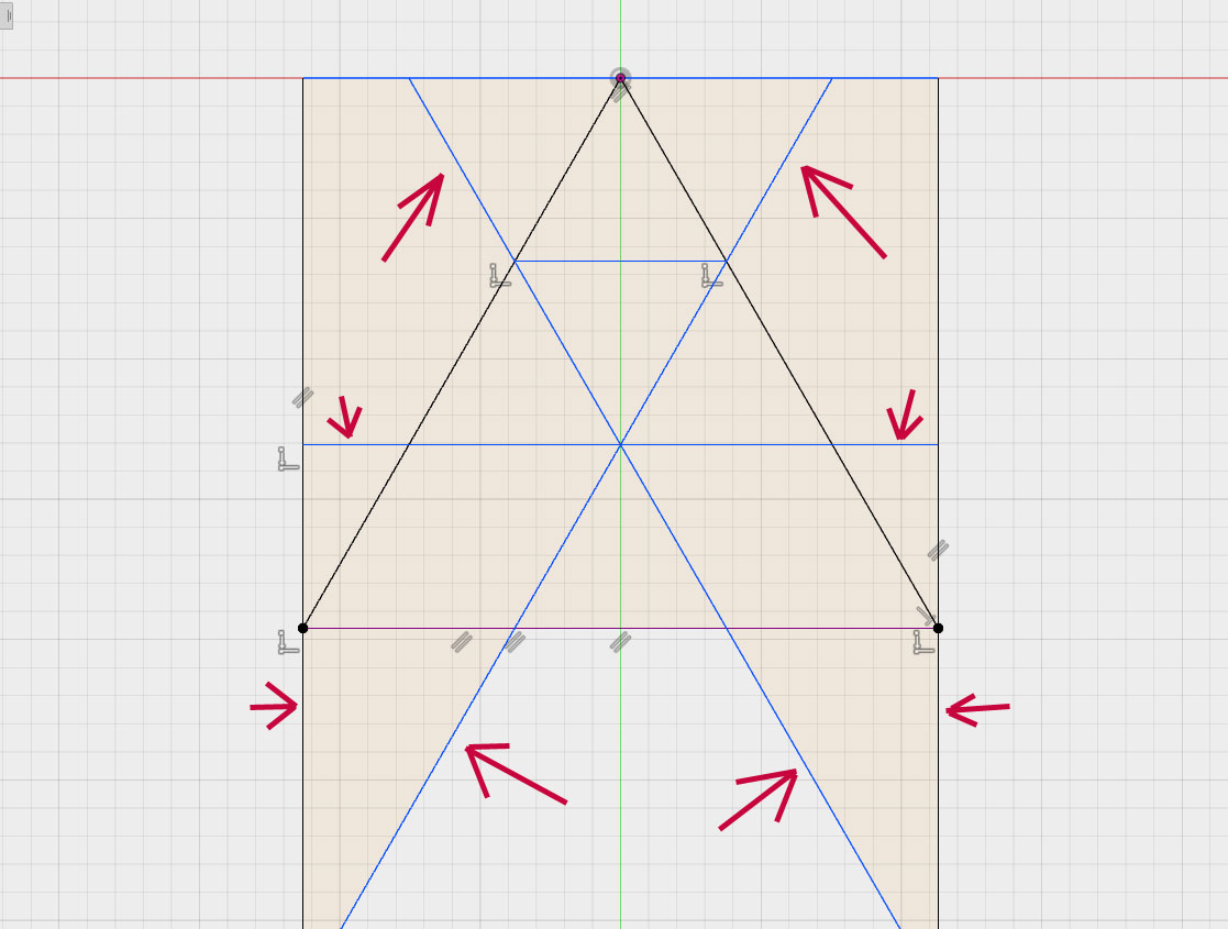 スケッチの「延長」機能を利用して、線分を図の状態に各線を伸ばしていく。線を伸ばした後オレンジの面がきちんとできていること。 オレンジ面にならない場合はどこかが足りないので、失敗している。多分最初からやり直し。