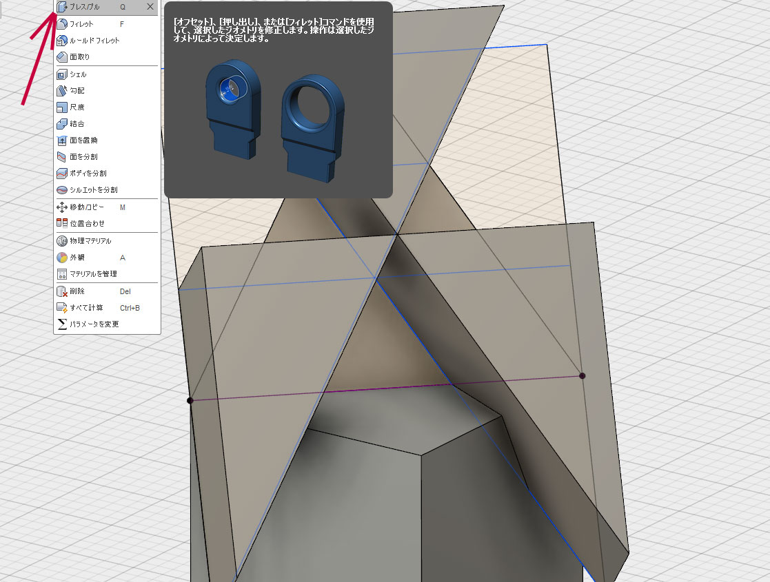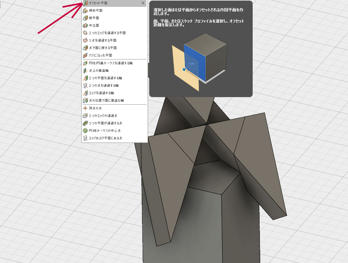 あと、天面も切り落としが必要だったが、基準となる面が無いので作成を行う。 構築メニューからオフセット平面を選ぶ。