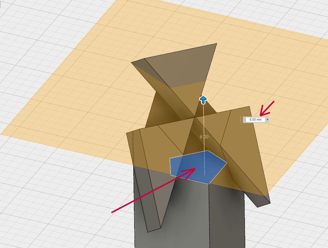 対象となる面は四角柱の上面。そこから8mmオフセットした位置に平面を作れば、天面となる。