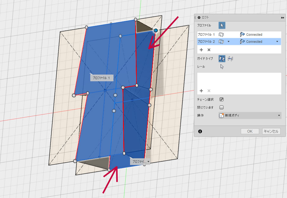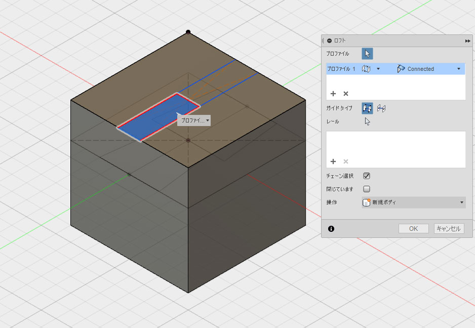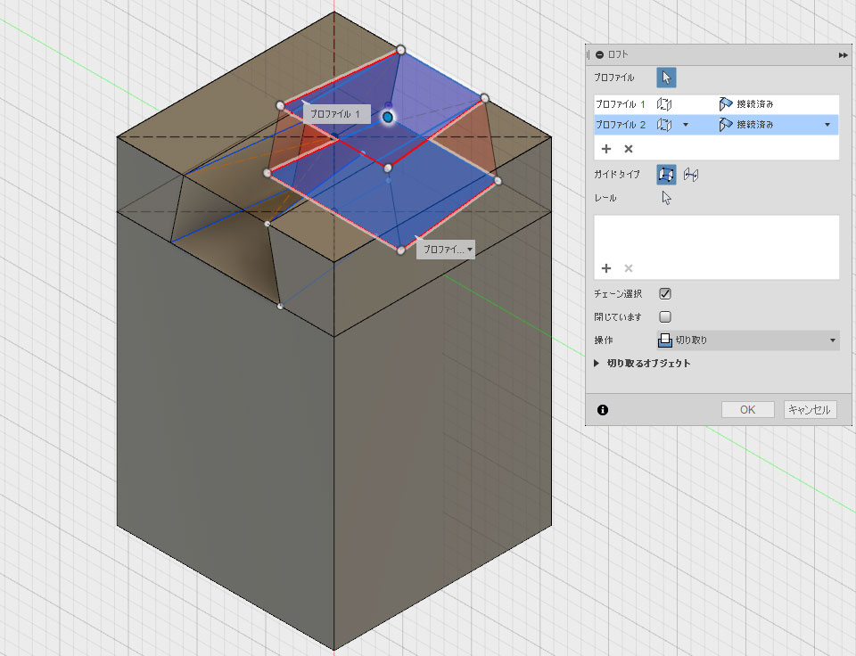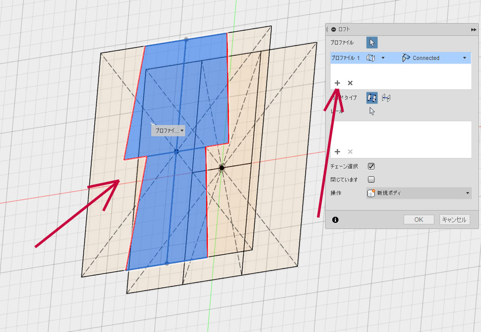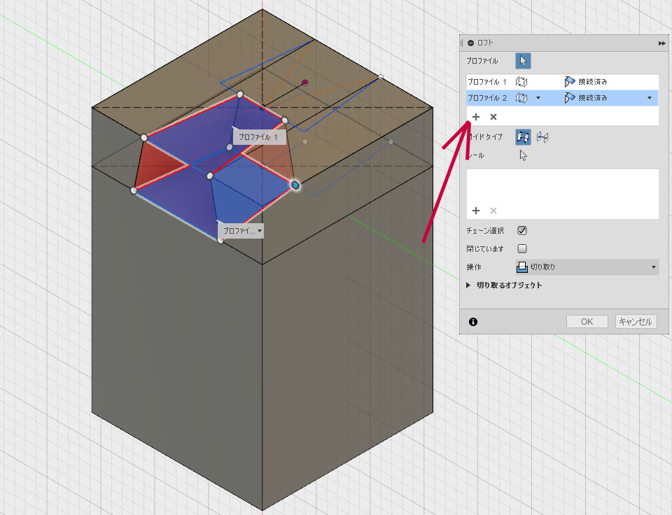 その後、右側ロフトの設定にあるプロファイルの中の「+」ボタンを押す。そしてスケッチ底面側の下側2つの面を選択すると、 上面と下面とをつなぐ範囲での切り取りブロックが出てくるので、実行する。