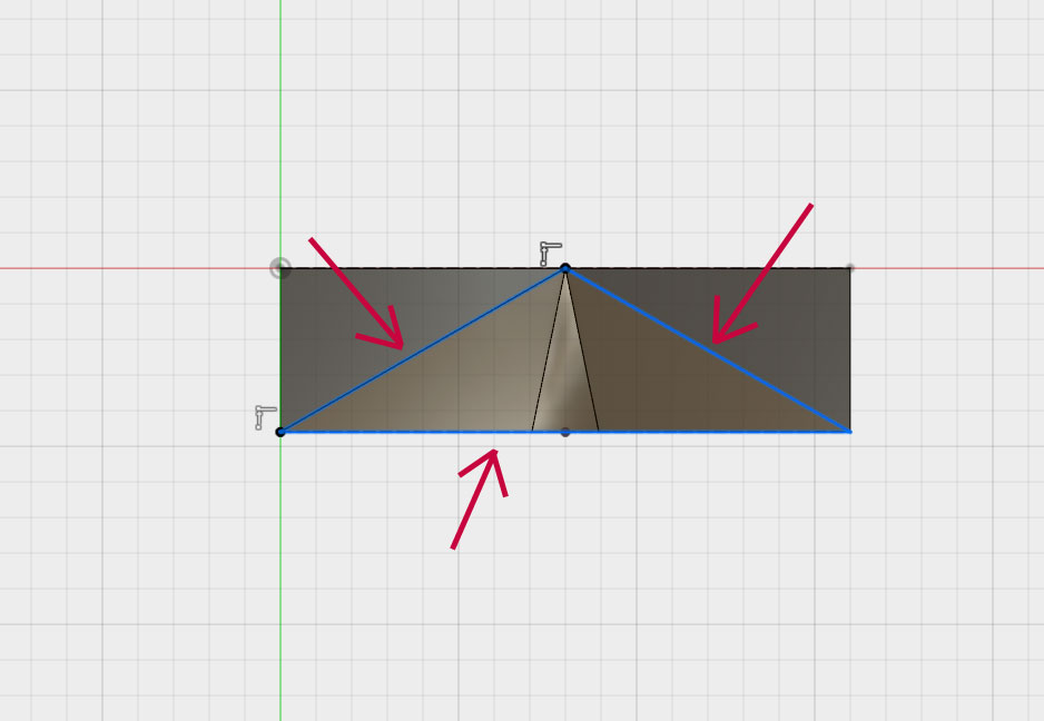 スケッチを作成したら、ボディの位置と合わせながら、上面の真ん中位置と底面の左右位置を繋いだ三角形を線分で作成する。 三角の中に色がついて面となっていること。完成したらスケッチ終了。