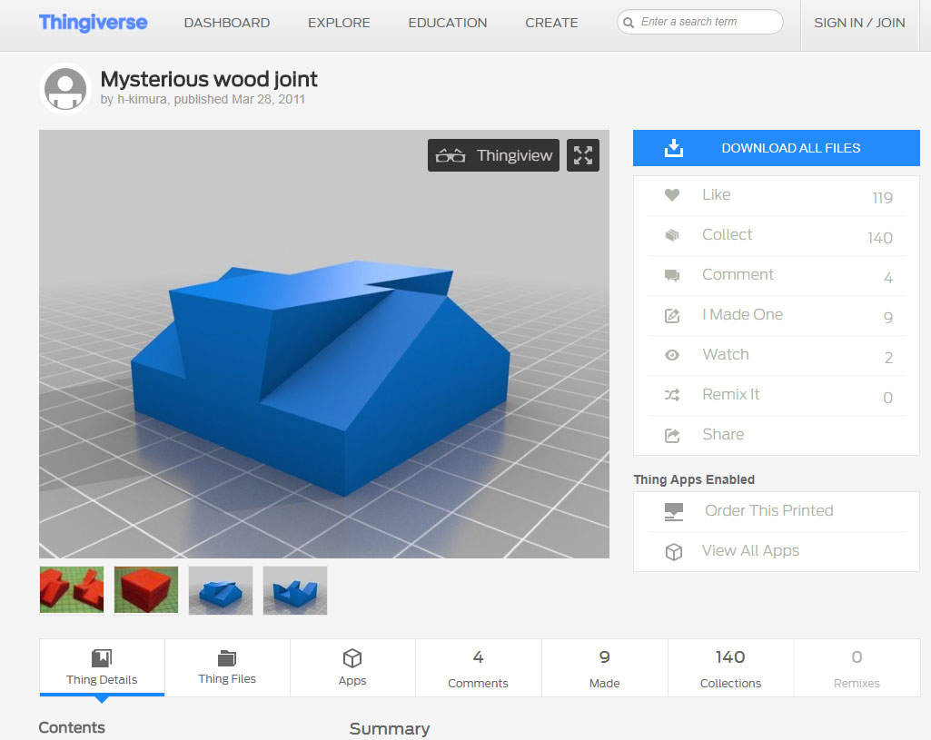 なんでも見つかるThingiverseにこれがあるか探してみると、「Mysterious wood joint」として一つ見つかった。