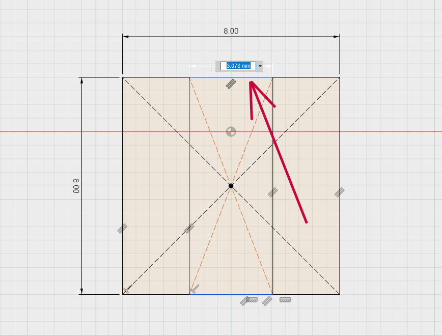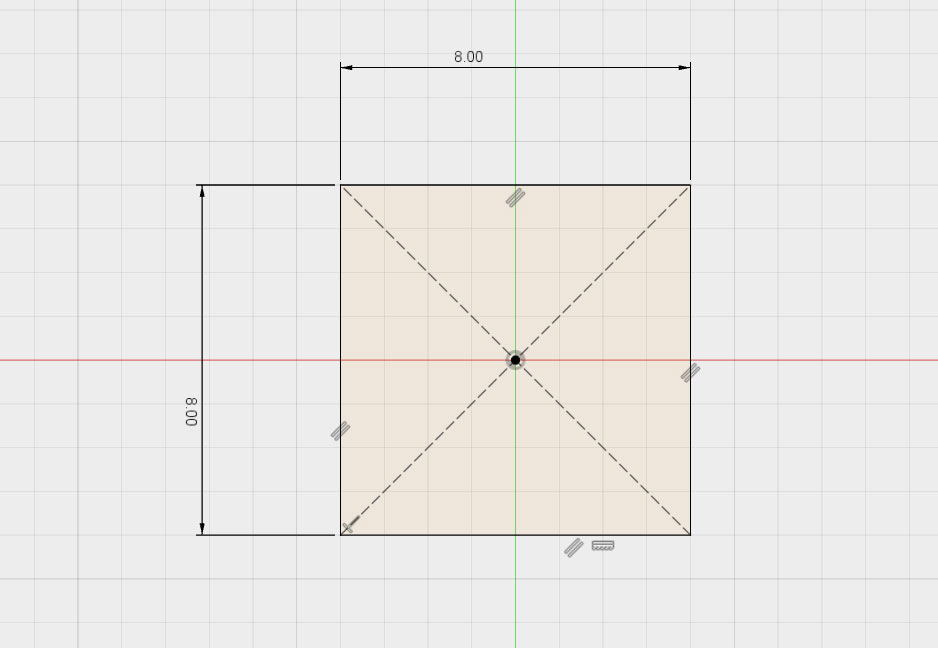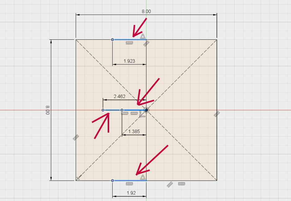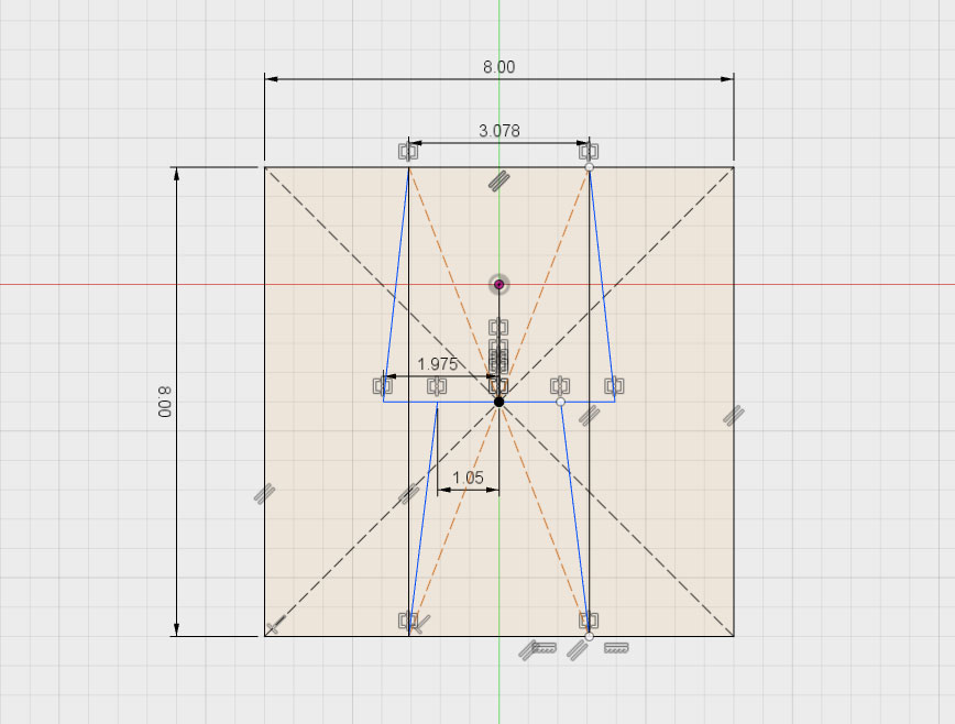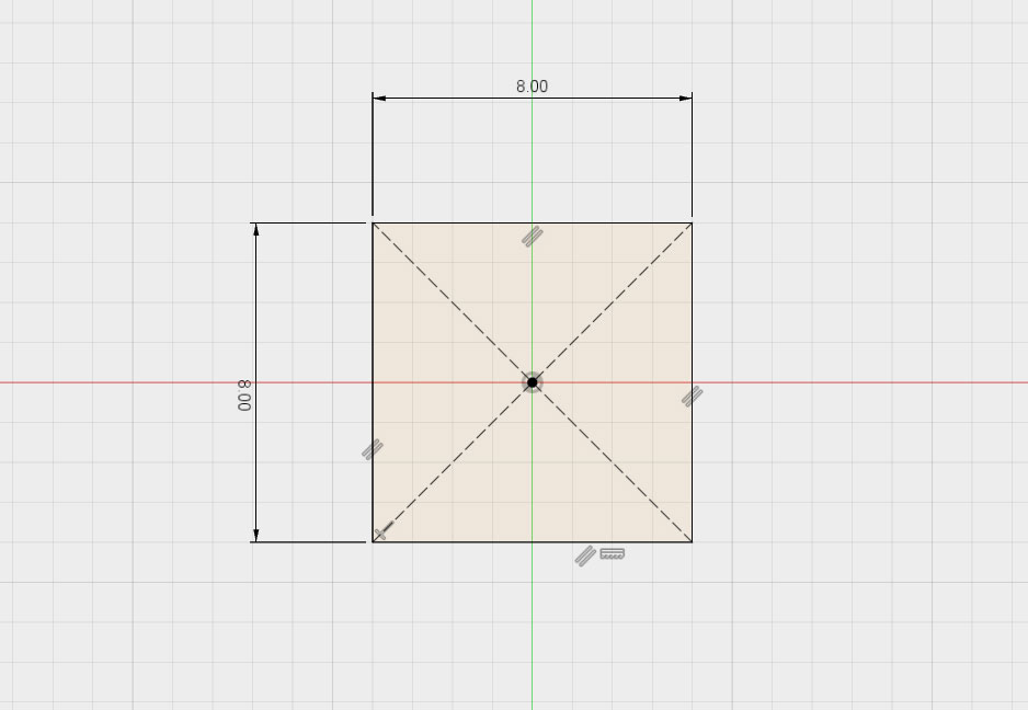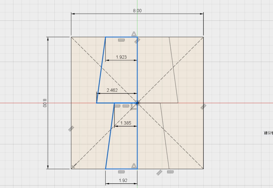 まずは最初のスケッチと同じ位置に同じ8x8の正方形を作成。その後は少し邪魔なので最初のスケッチを非表示にしながら、 四角の中心に縦長な8x3.078の長方形を作成する。