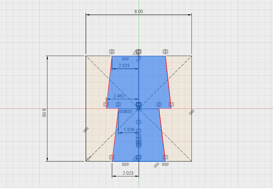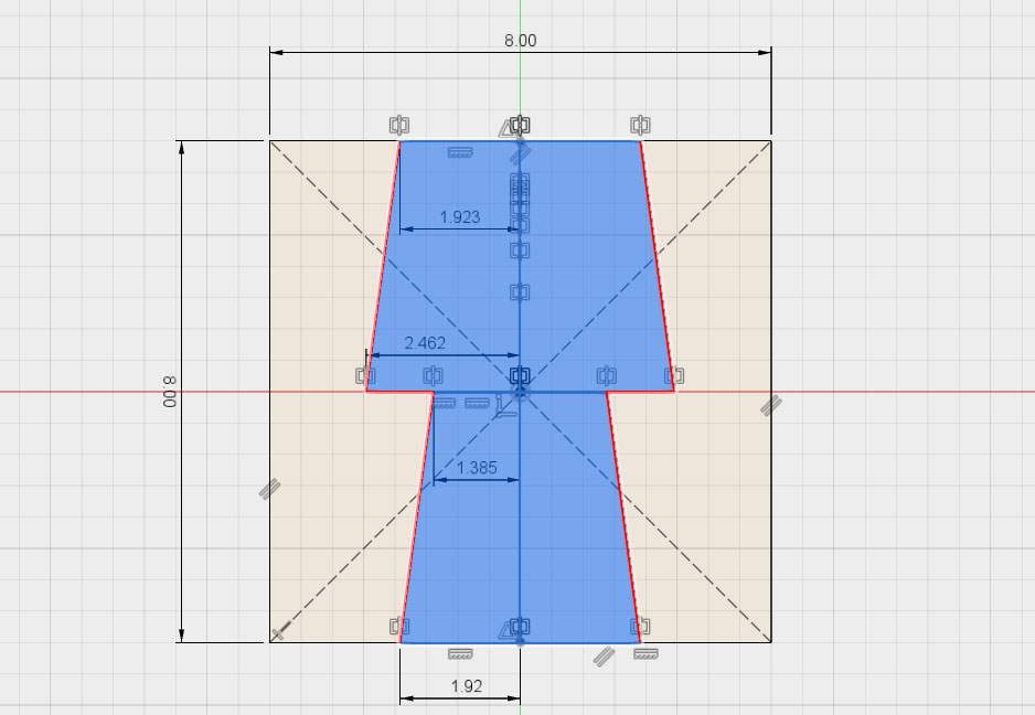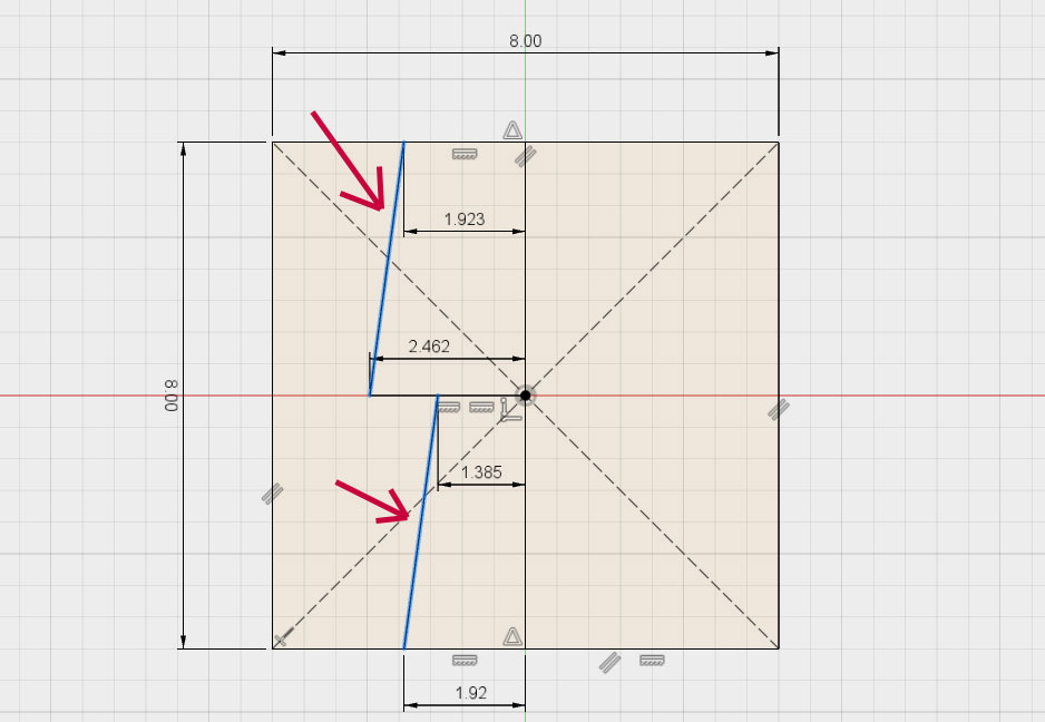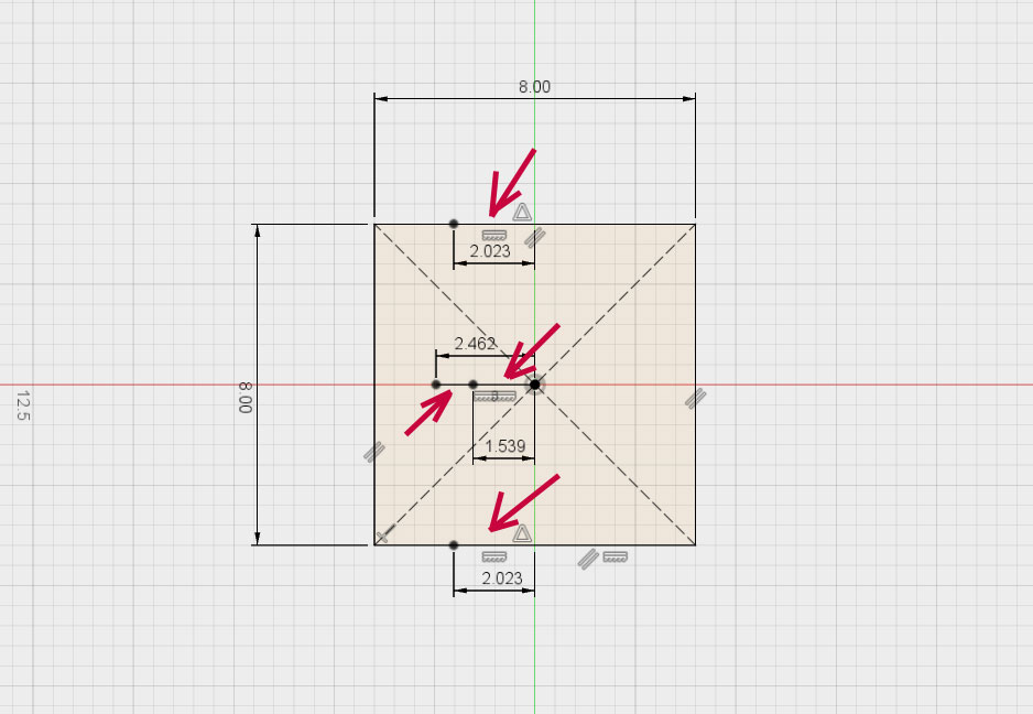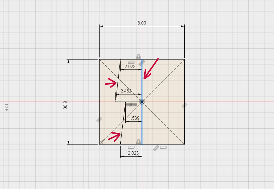 まずは最初のスケッチと同じ位置に同じ8x8の正方形を作成。その後は少し邪魔なので最初のスケッチを非表示にしながら、 四角の中心に縦長な8x3.078の長方形を作成する。