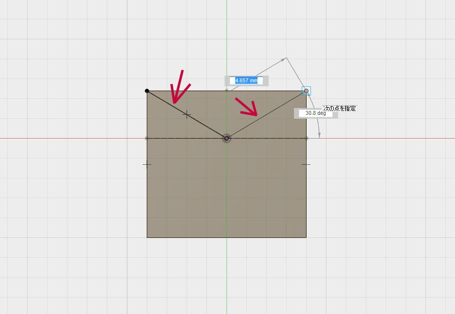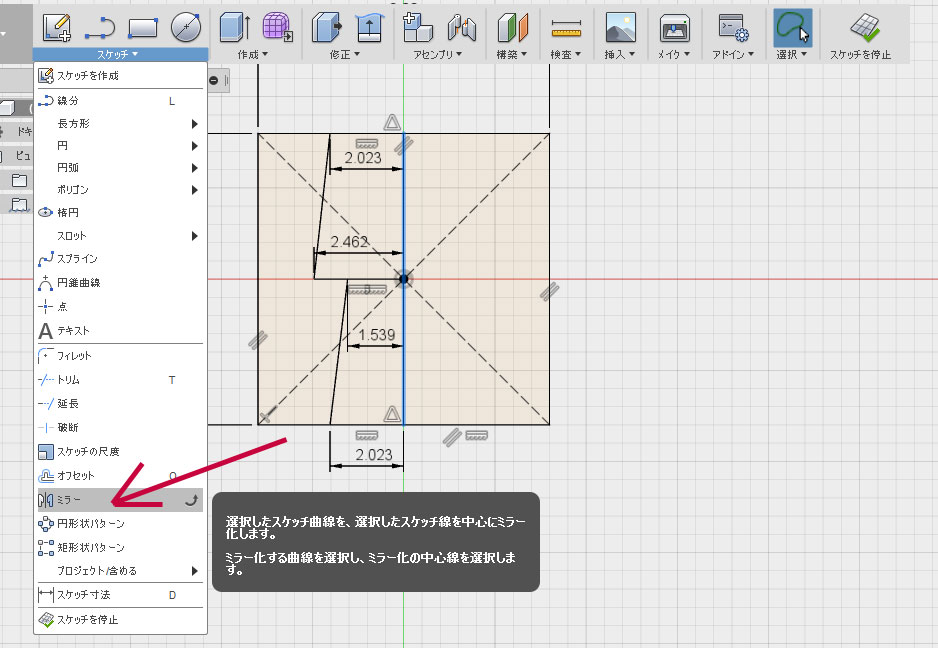 スケッチメニューのミラー機能を使って、左側に書いた線分を右側にもコピーする。
