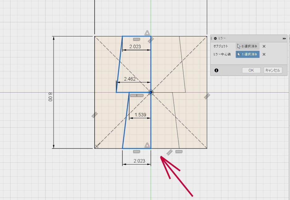 次にスケッチのミラー機能を使用して、先程の左側に作った線分を左側にもコピーする。