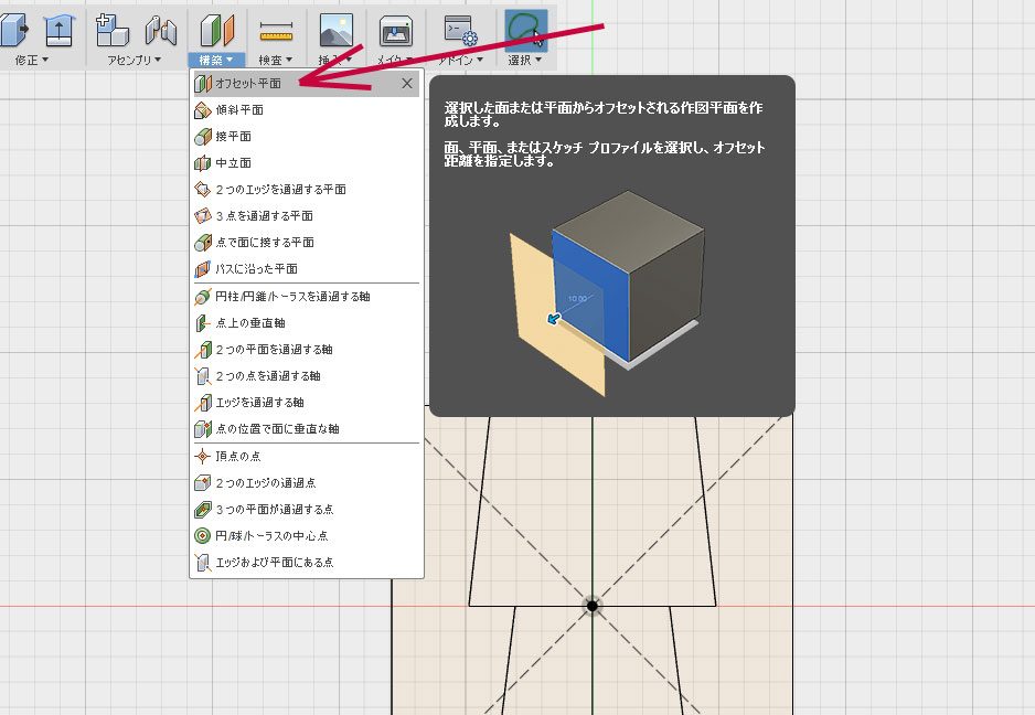 次に上段部分を作成する。構築メニューから、オフセット平面を選択。