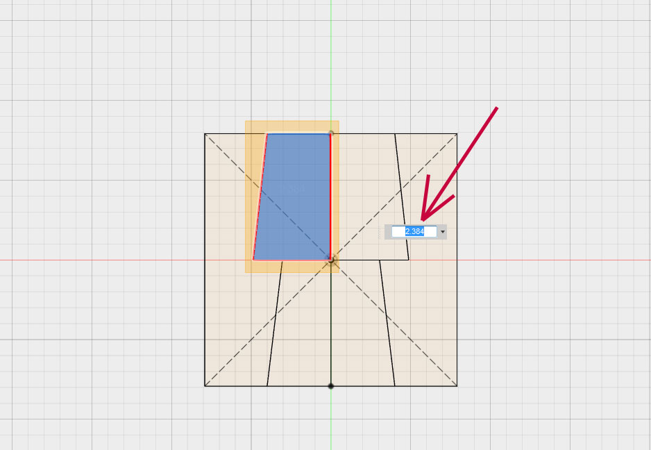 ※追記上面はこれだけではだめだった。小さいサイズならこれでもごまかせるが、 大きいサイズだとゆがみが見えた。上面についても、もう少し手を加える。中心位置から、1.975と、1.05の横線を入れる。 そして、それぞれ下図のように線を引き、左右対称にしておく。
