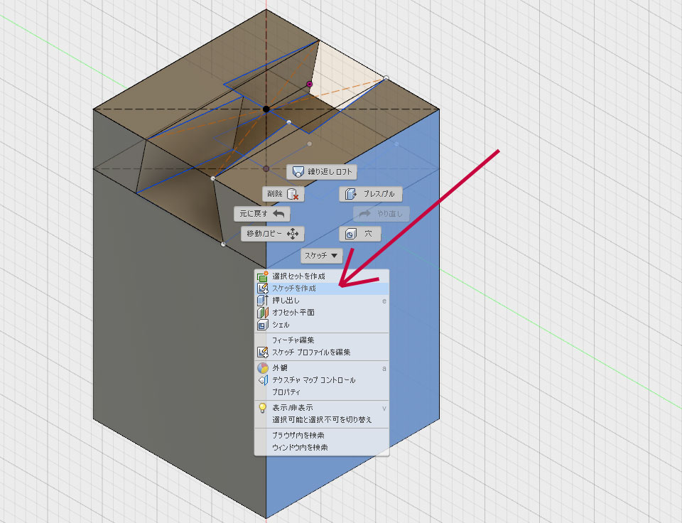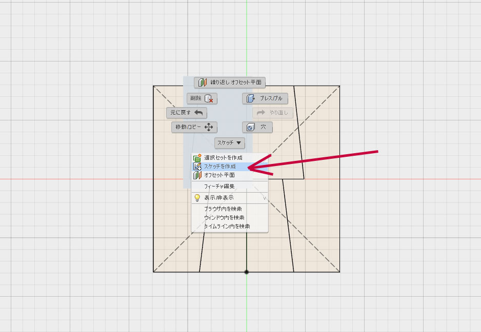 平面が構築できたらそこにスケッチを作成する。図では平面を選択した状態で右クリックしてスケッチを作成としている。