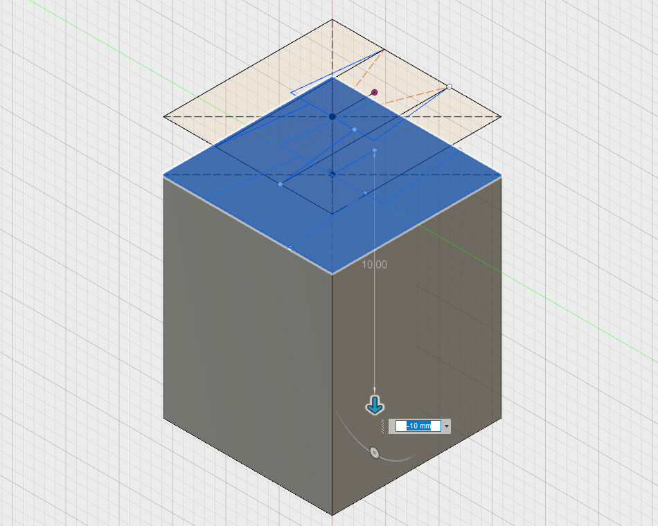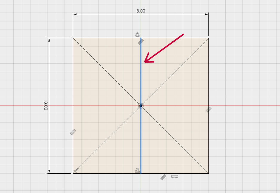 次に上面側を作成する。最初に作成したオフセット平面を選択して、スケッチ作成を行う。 センター部分が揃っているので操作がし易い。底面と同じ位置に8x8の正方形を作成し、縦棒を真ん中に引いておく。
