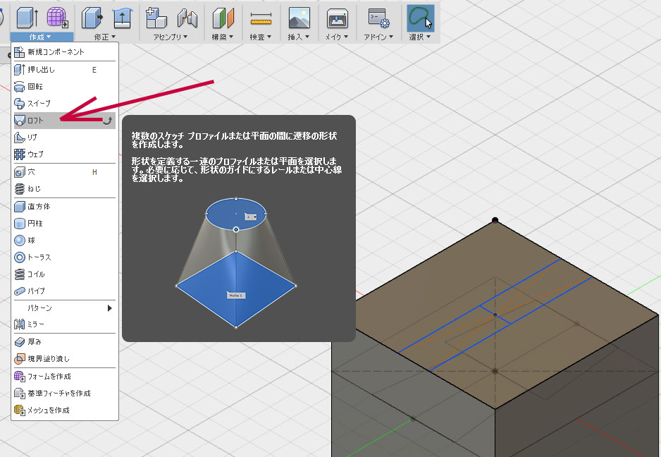 ここから、「ロフト」を使用する。作成メニューからロフトを選択。