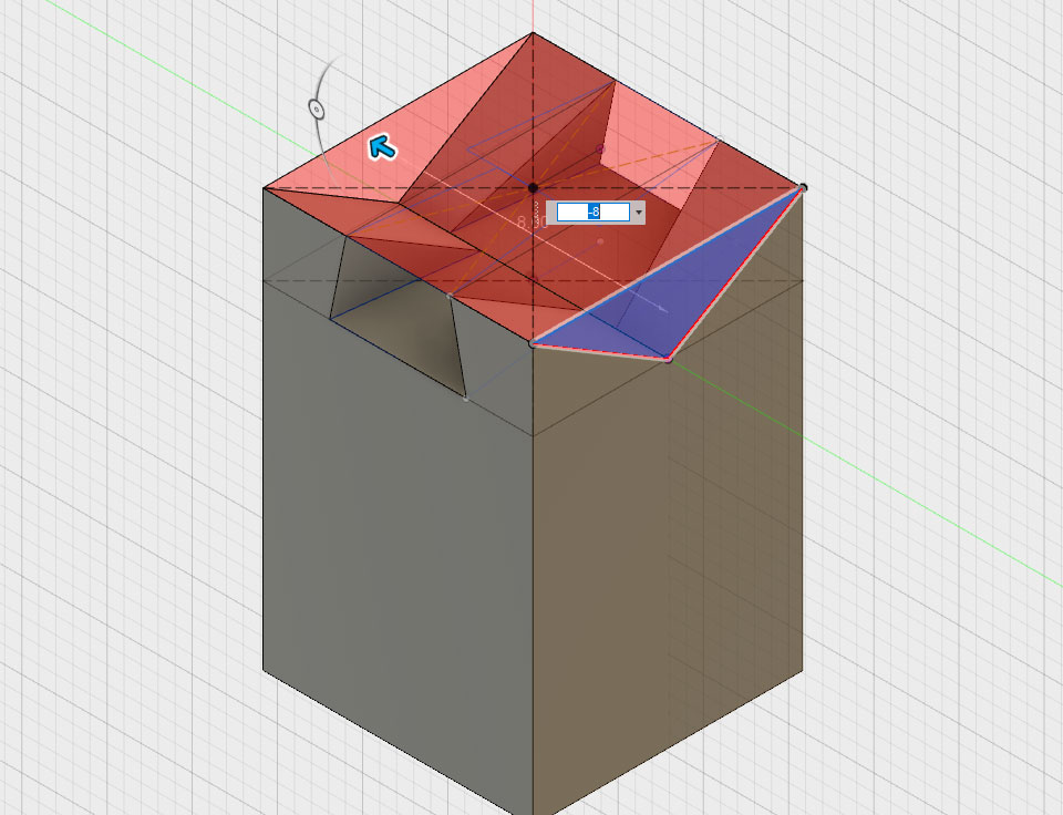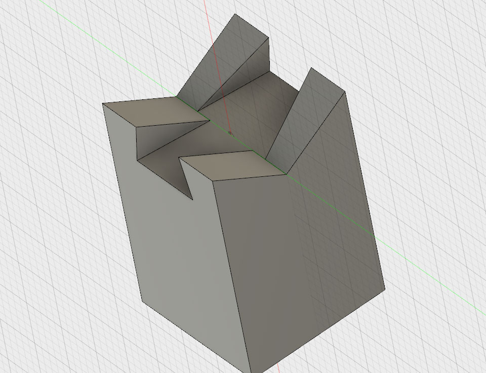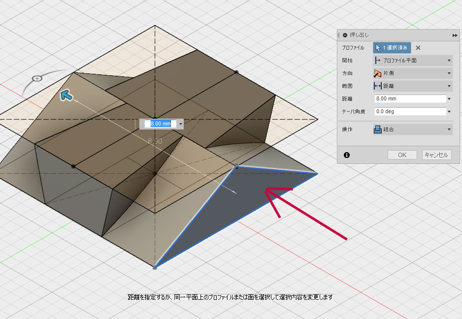 先程作った三角形の平面を利用して、押し出しで8mmの山を作成。切り取りではなく結合で作成する。 これで継手箇所は完成。