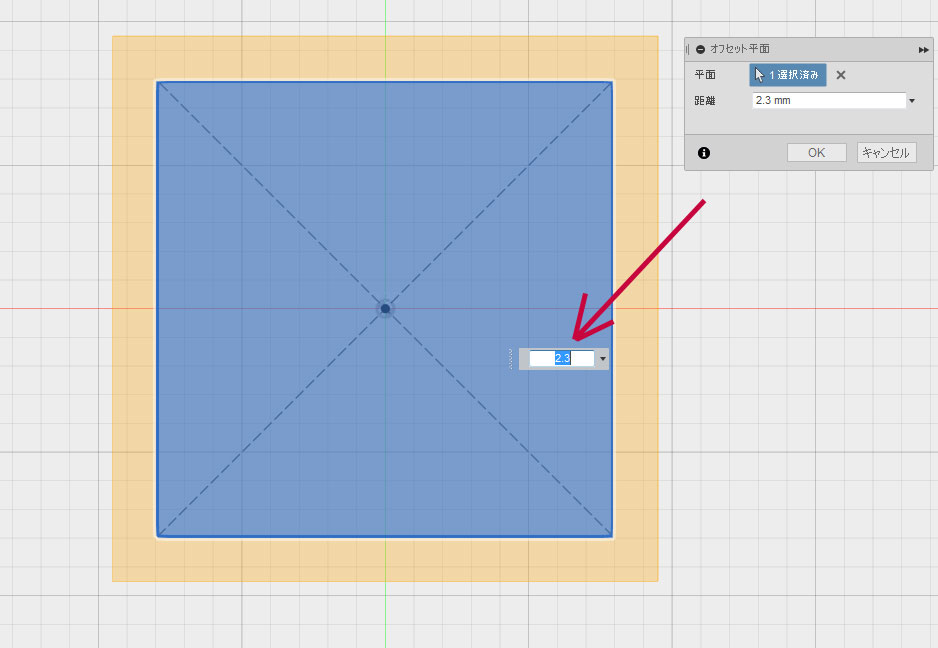 先ほど作成したスケッチの適当な面を選び、オフセット値を2.384とする。