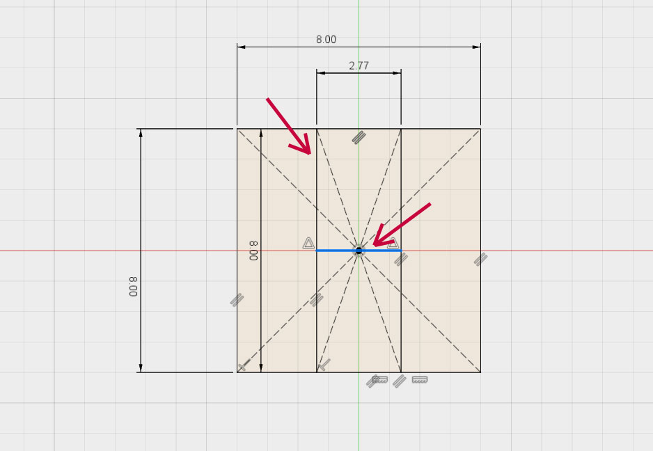 構築でオフセット平面を作ると、一旦スケッチが終了するようなので、先程のスケッチを編集モードにして続きを行う。 正方形の中に2.77x8の縦長の長方形を作成する。そしてその真中に横線を入れておく。これで底面スケッチ完了。