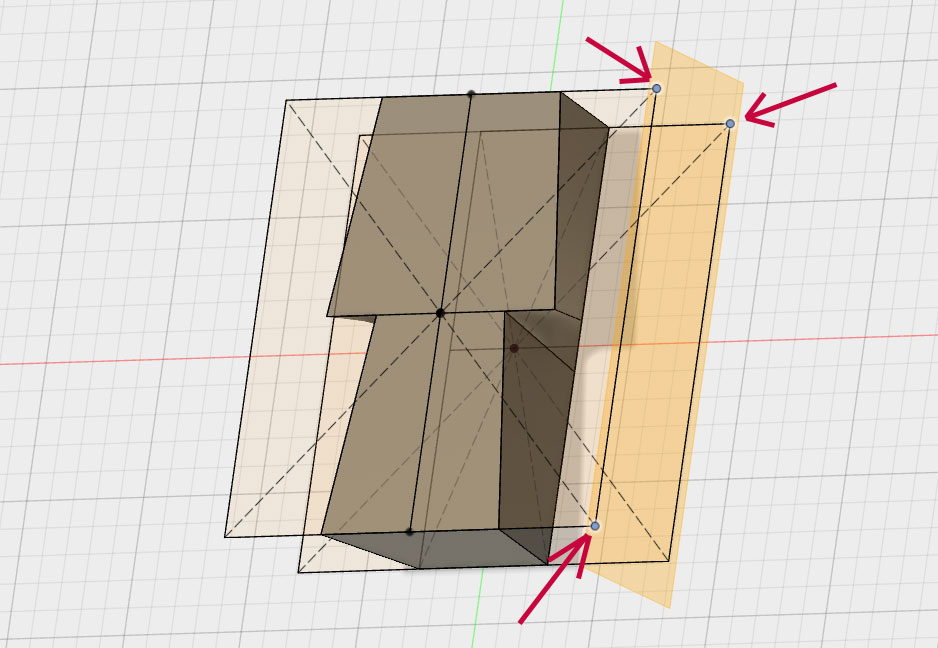 次に側面の平面がほしいのだが、基準となる良い平面がないので、構築メニューから「3点を通過する平面」を選択。 図の箇所の3点を選択して平面を作成する。平面が出来たらその平面でスケッチを作成する。