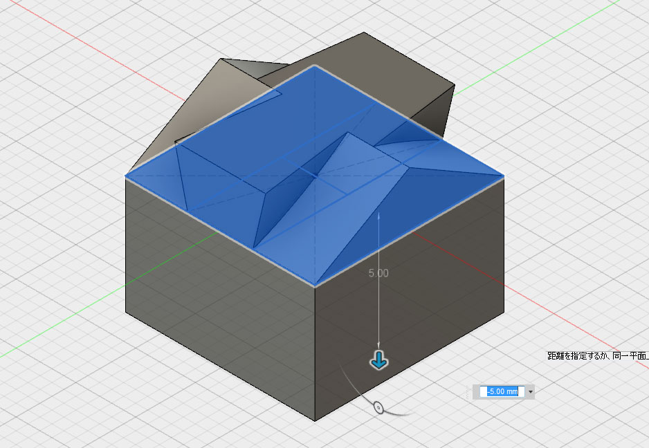まずは柱部分となるところを作っておく。下側平面全部を選択して5mmほど押し下げる。 サイズが小さく持ちづらいので、10mmでもいいかも。