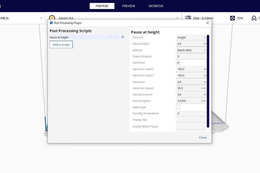 記事を見てみると、Curaのスライサーソフトだと「Pause at height」というスクリプトが組めるらしい。 特定の高さの時に、スクリプトを差し込むようだ。記事の紹介では、造形途中で処理を止めて、フィラメントを交換したり、ナットや磁石などを埋め込んだりを行うみたい。