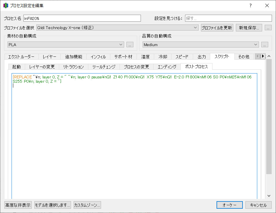 自分はSimplify3Dをスライサーとして使っているので、こちらにはそのようなスクリプト差し込み機能はないらしい。 しかしいろいろ探してみると、gcode出力の後にコマンドを実行する機能があり、 これを使って特定レイヤー時に特定コードを差し込むことができるらしい。