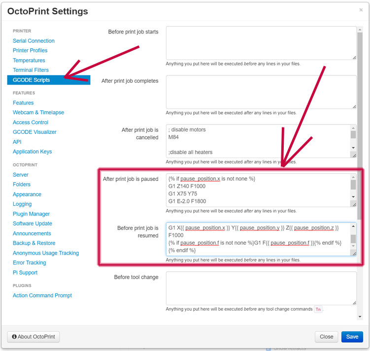 うまくタイミングを見て一時停止ボタンを押す必要がありそうだが、ある程度手軽にできそうでよさそう。 OctoPrintの設定画面で左メニューの「GCODE Scrips」を選び、「After print job is paused」に以下を入れる。