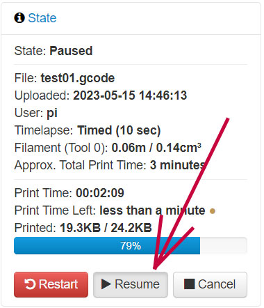 この停止コマンドが来たら、ベッドが下がり、冷却ファンが停止。 その間にフィラメント交換を行い、完了したらOctoprintより「Resume」を押して印刷を再開すると、 新しいフィラメントで印刷が再開される。