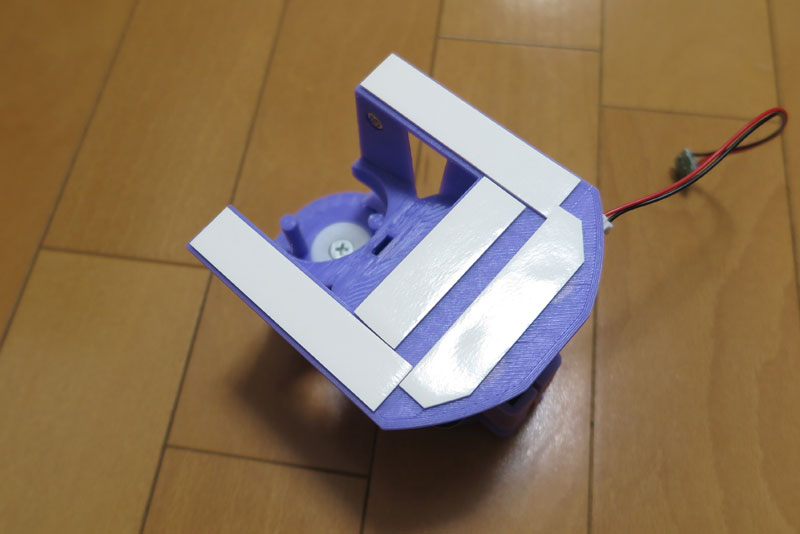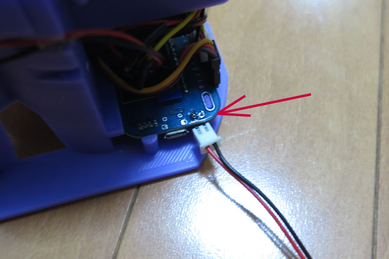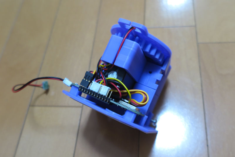 ということで、obnizを予定位置に取り付けて、配線を実施。ケーブルは極力まとめて隠すように押し込む。 動作部分に触れると、巻き込んでしまうかもしれないため、ギア部分には当たらないようにしておく。