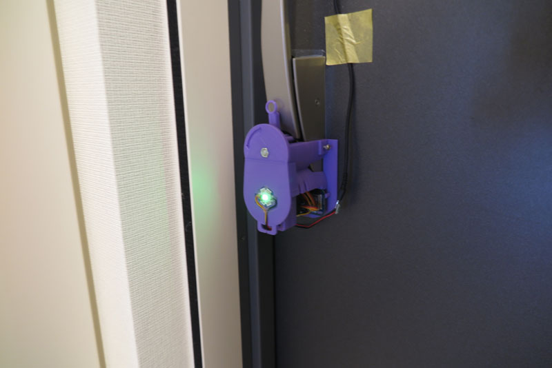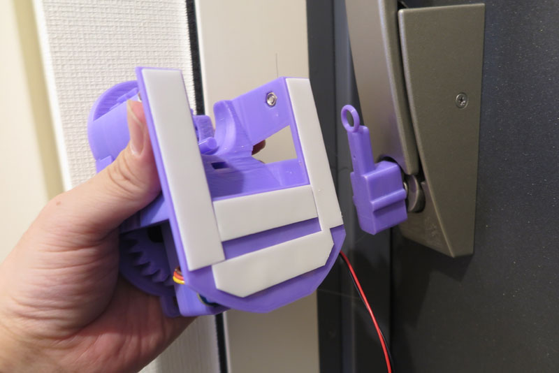 そして、本体を扉に張り付ける。両面テープと磁石の力で取り付ける。さらに下側については、テグスも扉の錠に引っかけておき、 落ちてしまわないようにしておく。ここまでやっておけば大丈夫だろう。
