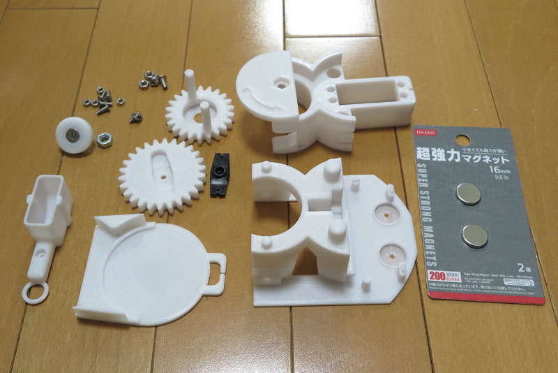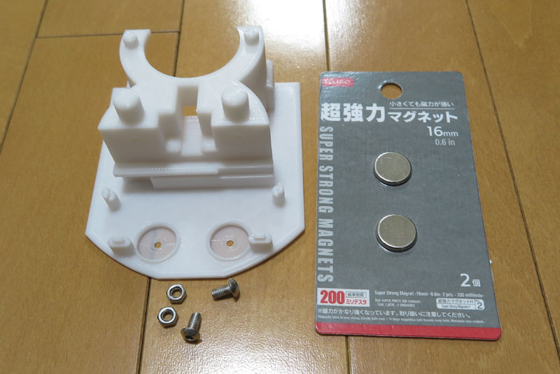 まずは土台部分。こちらは、扉にくっつけるための磁石と、テグスで固定用のねじなどで構成。 作業としてはねじをはめ込むのと、磁石をはめ込むのみ。 磁石はぎりぎりサイズなので、丸いはめ込み箇所に無理やり押し込めば完了。外すときはほぼ土台が壊れるので、廃棄時以外は取り付けたらそのまま。