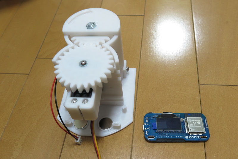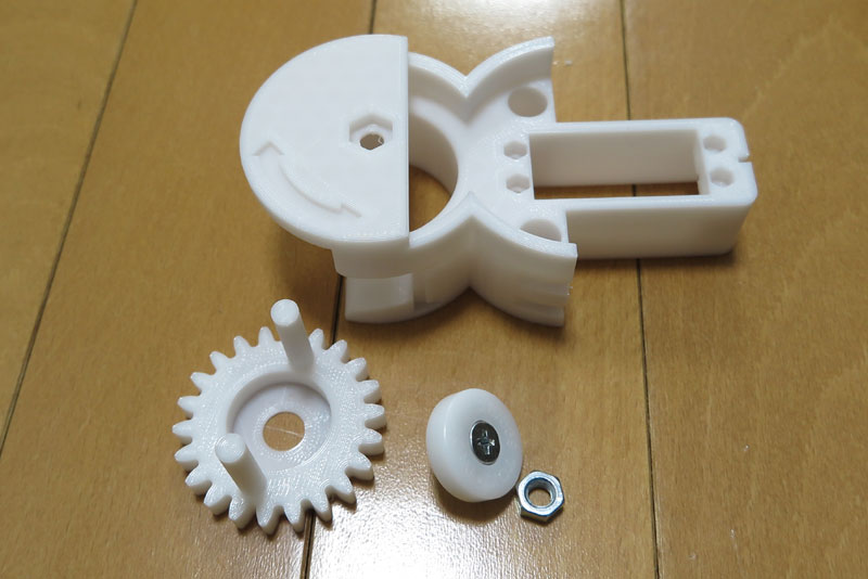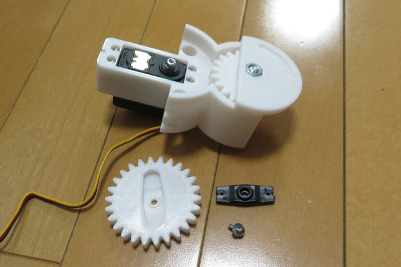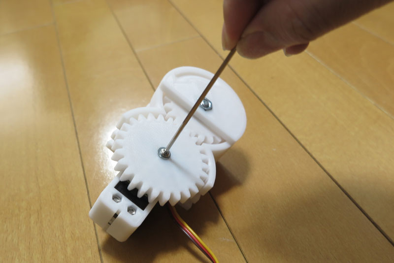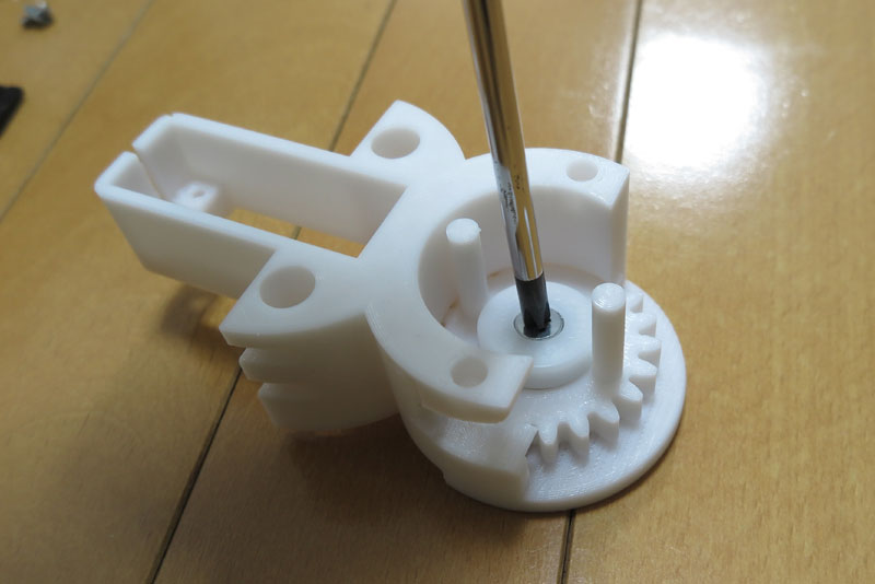 位置が決まったら、サーボに歯車をねじで固定する。M3のねじで止めることが出来たので、きっちり止めておく。 でもこの後3回も歯車位置調整を実施。タッピングビスではないために、簡単に取り外しできるので、位置合わせをしっかり行っておく。