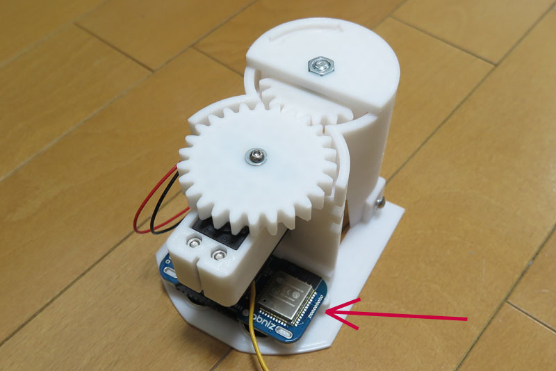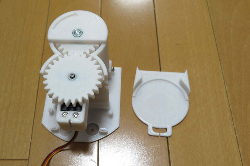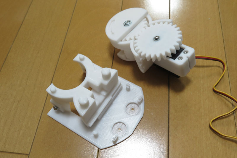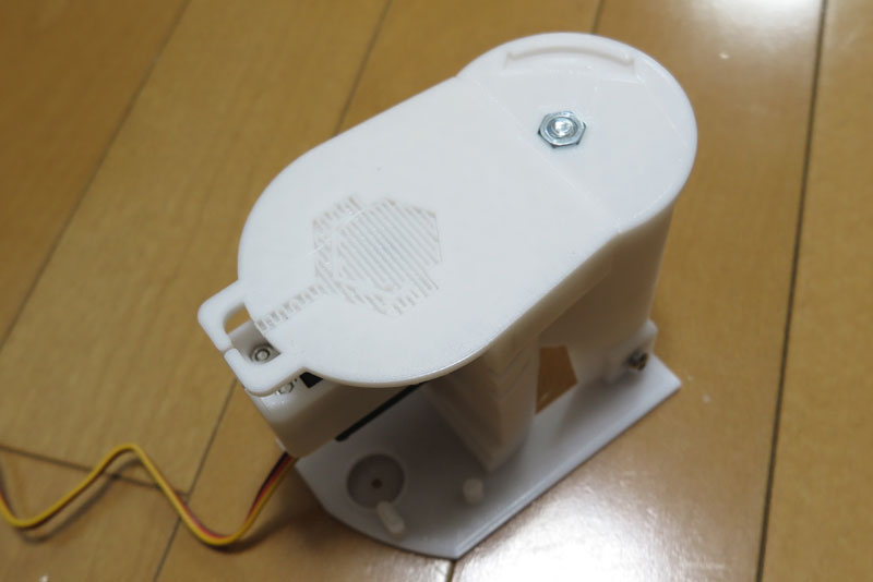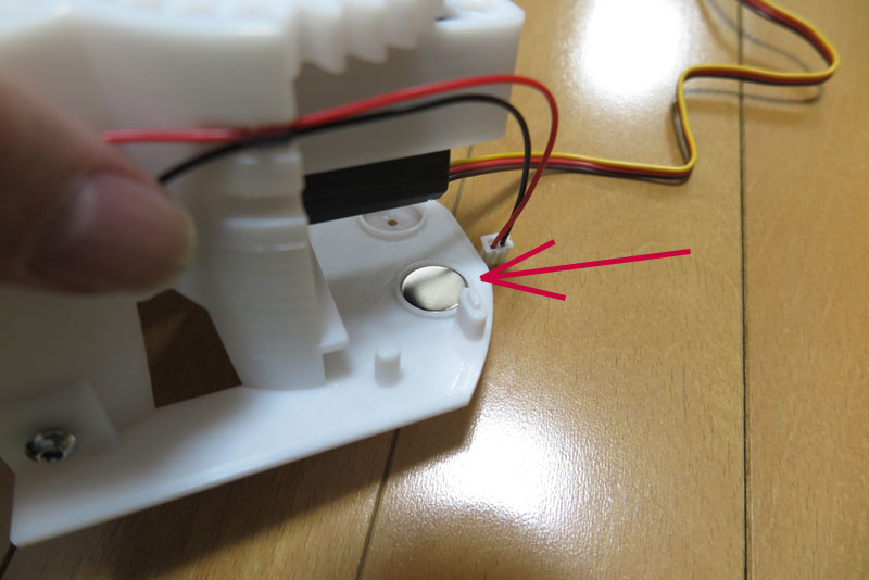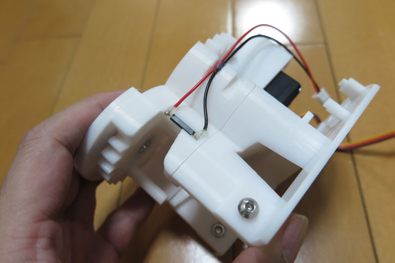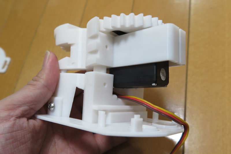 結合自体は突起と取付穴があるので、これらを差し込めばよいのだが、サーボのケーブルがあるのでこれをうまく取り廻す必要がある。 サーボが土台にはまる箇所にケーブルの逃がし溝があるので、ケーブルがここを通るようにしておき、合体させる。