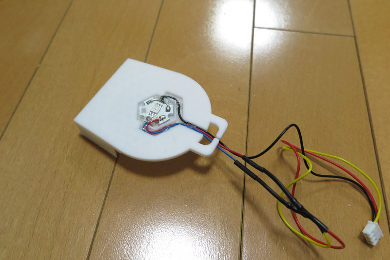 てっぺんのカバーへのLED取り付けはこんな感じ。星形土台付きのLEDを取り付ける。フルカラーLEDなのだが、赤と緑だけ配線してあり、 せっかくの青色LEDは未使用。もったいない?