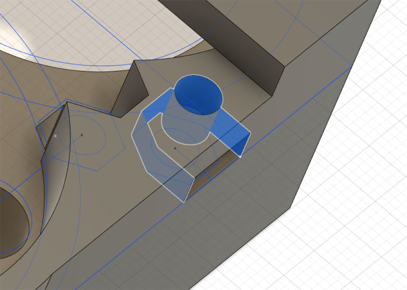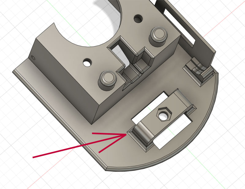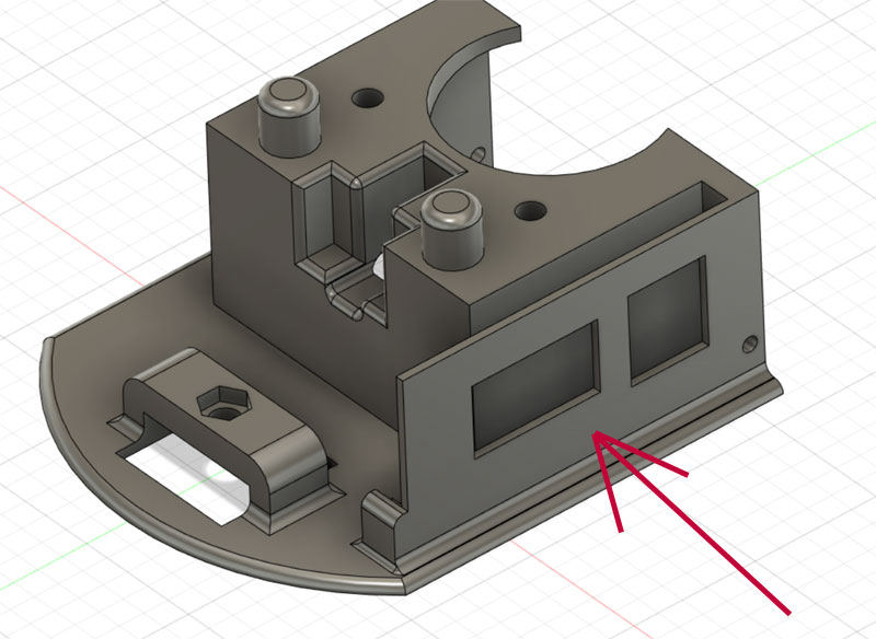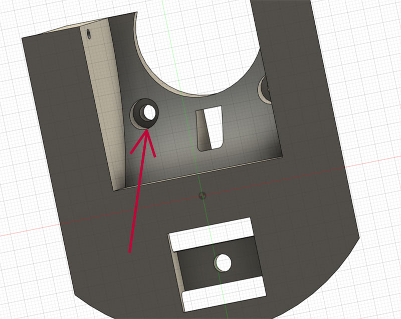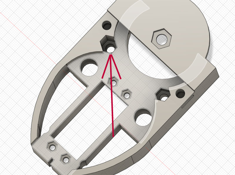 本体側は、台座からくるねじを受け止めるナットを設置。ナット用の穴を用意してここで結合予定。 長いねじがないので、30mmのねじで止めることが出来るようにナットを落とし込む六角穴を用意。うまくナットがハマってくれるかな?