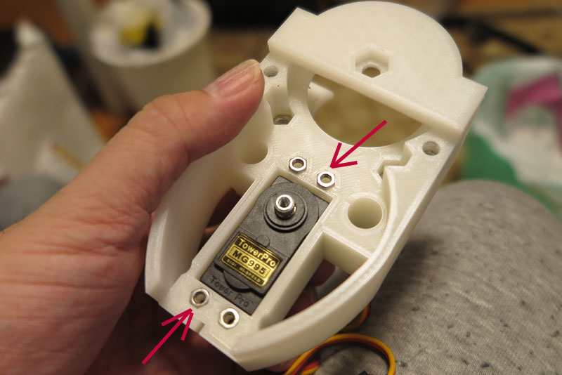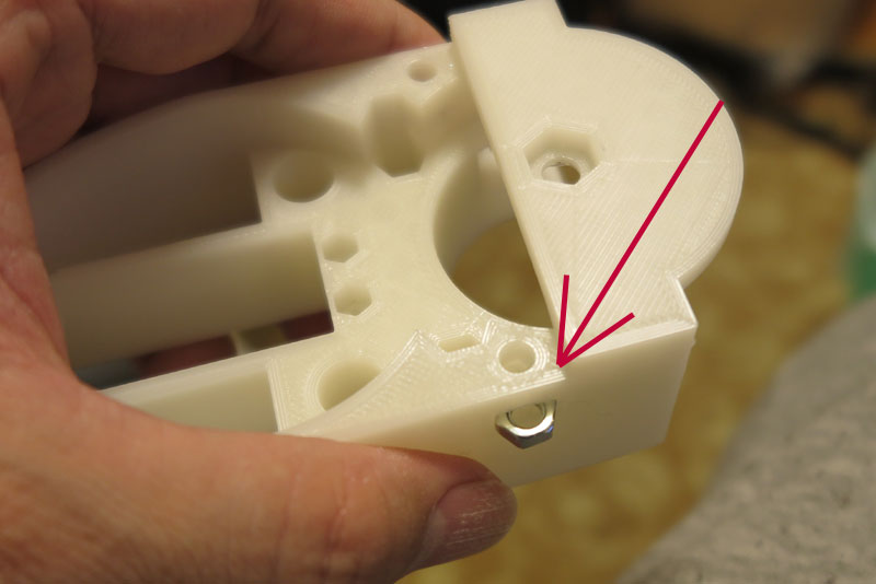 サーボの取り付けも同様。M3のナットなので、かなり小さい。これ以下のサイズになると3Dプリンタでは無理そう。 ナット穴を用意して、そこにナットをいれればOK。3D-CADで設計しているからサイズはどれも同じはずだが、 簡単に入る穴と、きつくて指で押し込んでも入らない穴ができるのはなぜだろう。 0.1mmレベルでスライサーの端数処理で微妙にずれているのだろうか。