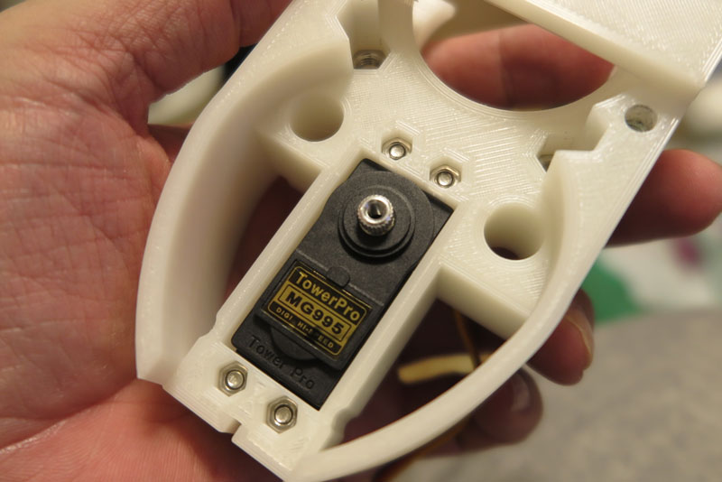 少々のきつさ具合は、ねじで無理やり押し込み作戦で、穴にねじ込み可能。きちんとねじで止めてやれば、 サーボの固定完了。4つのねじで留めれば、かなりしっかりとした固定となる。