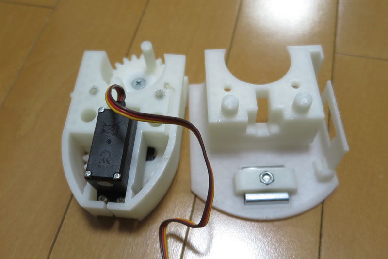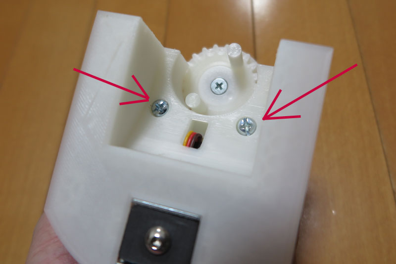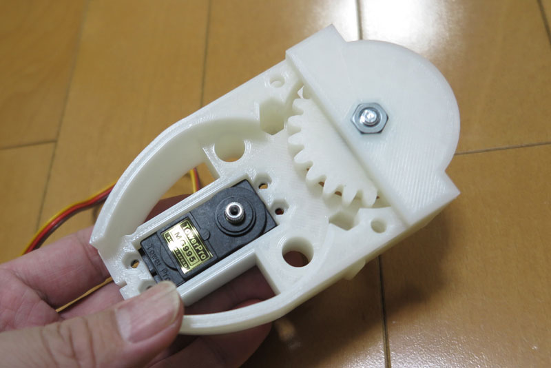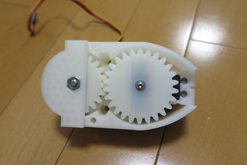 サーボ側にもギアを取り付けて、噛み合わせておく。サーボ側もねじでしっかりとギアを固定しておく。