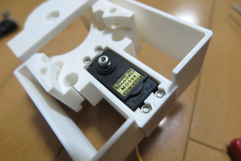 サーボをはめ込み、ギアを装着。サーボ側のギアを取り付けるために、サーボにサーボホーンを取り付ける。 ここにサーボ側のギアを取り付ける。ちょっとギアのかみ合わせがキツキツ。 でも実際に動かしてみると問題なく動作したので、問題なさそう。