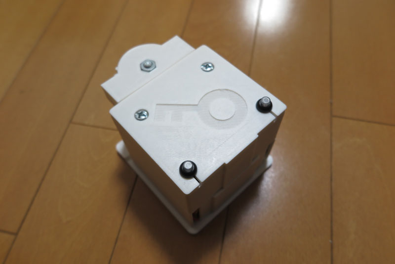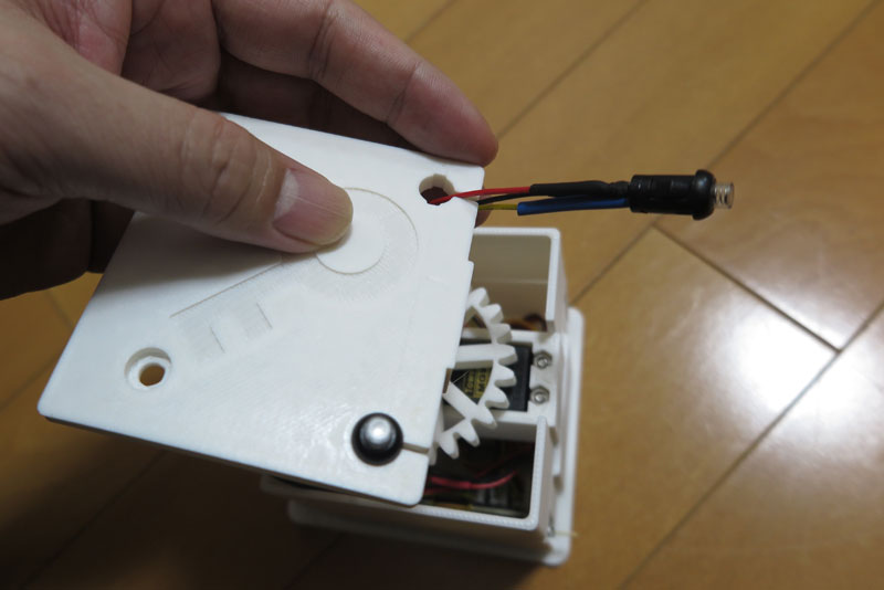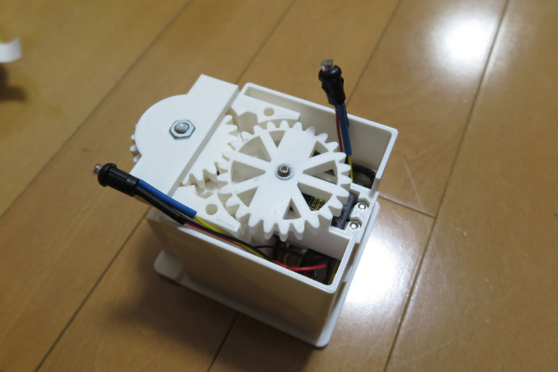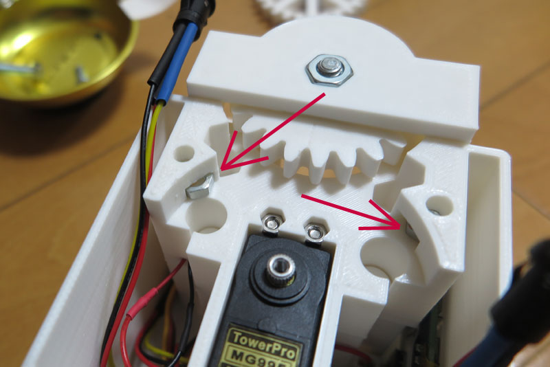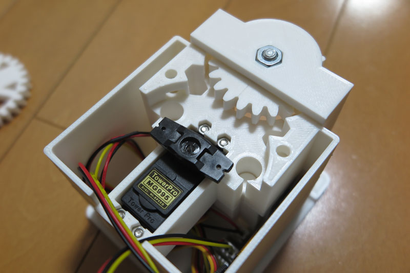サーボへのギアをはめる前に、ふた取付用のナットをあらかじめ仕込んでおく必要あり。何度か忘れてギア取り外しを実施。 ナットを入れてからギアをはめ込めばギアが邪魔でナットは外れない。
