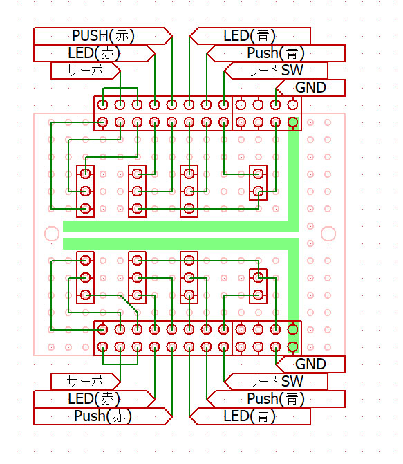 単純なオスピンでそのまま配線しているので、これを下段に基盤を配置するなどして、少し安定するようにしてみたい。 基板へのオスピン設置と、サーボやLEDにはコネクタを介して接続するようにしてみる。 LEDはLED内蔵スイッチを使用し、点灯しているLEDを押しても、施錠/開錠動作ができるようにする。
