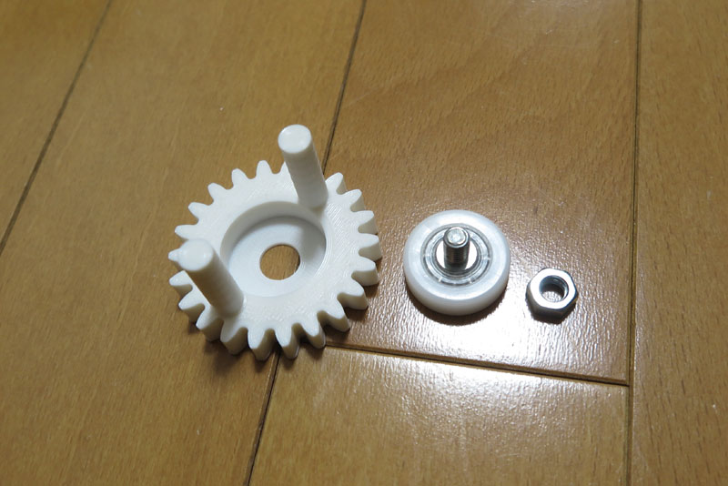 次にギア側の準備。扉の鍵のノブを回す部分。真ん中にベアリングを入れて回りやすくする。