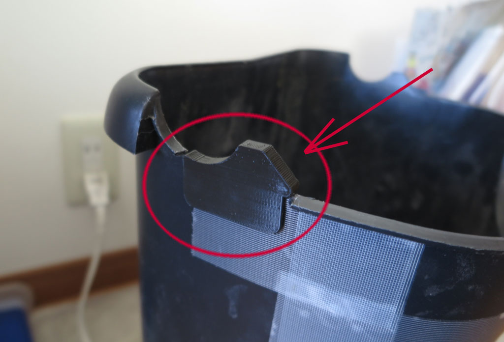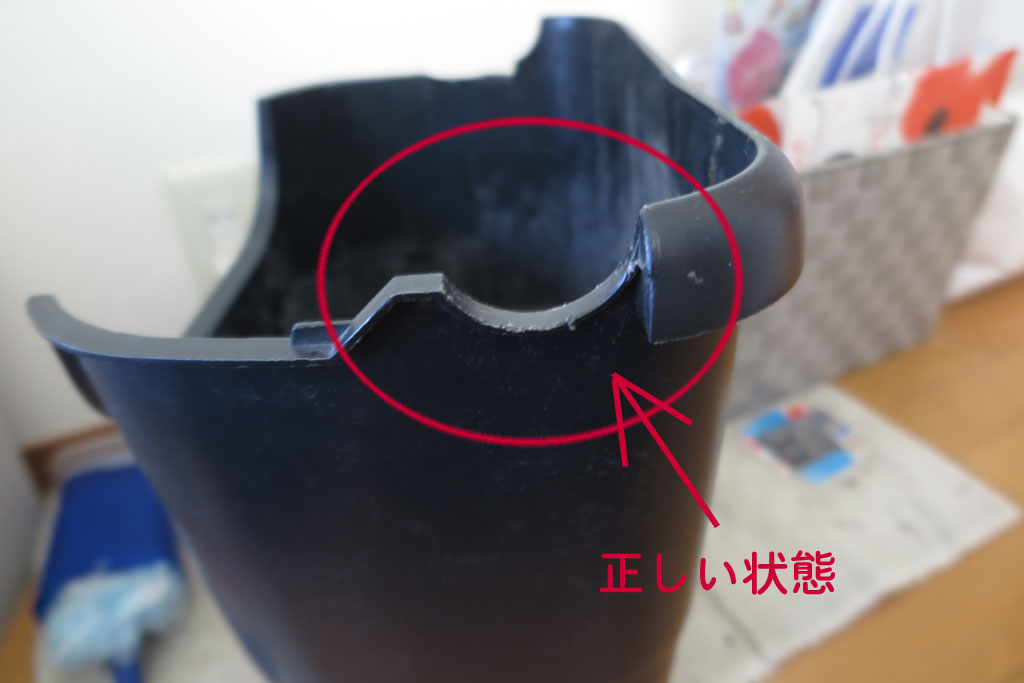 上の裁断部分はくるりと回転出来て、裁断部分やゴミ箱内部が覗けるようになっている。その回転を支える両脇部分の左側が壊れた。下図は右側の大丈夫な方。